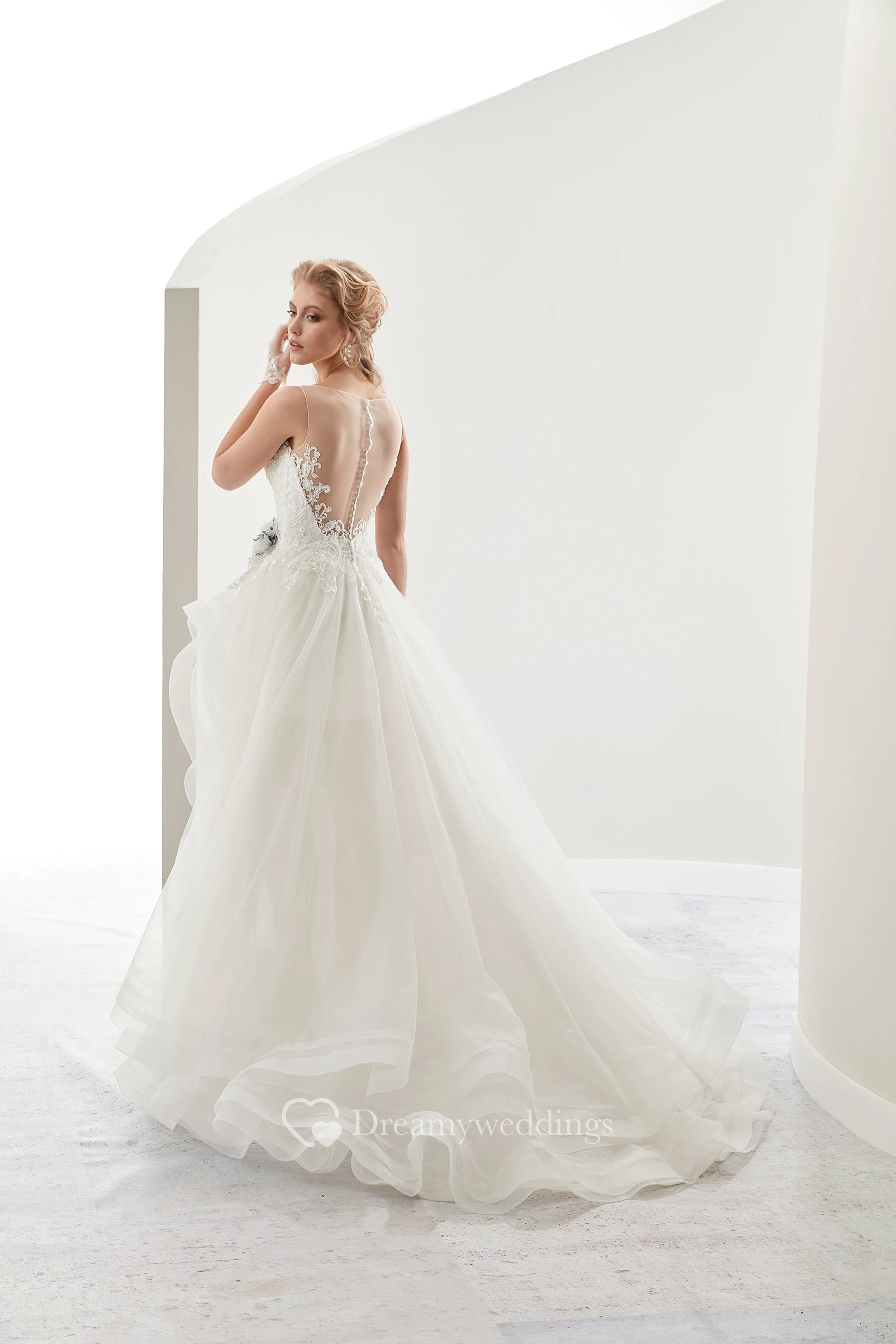 Cap sleeve High-low Bridal Gown with flower Embellishment and Ruffles