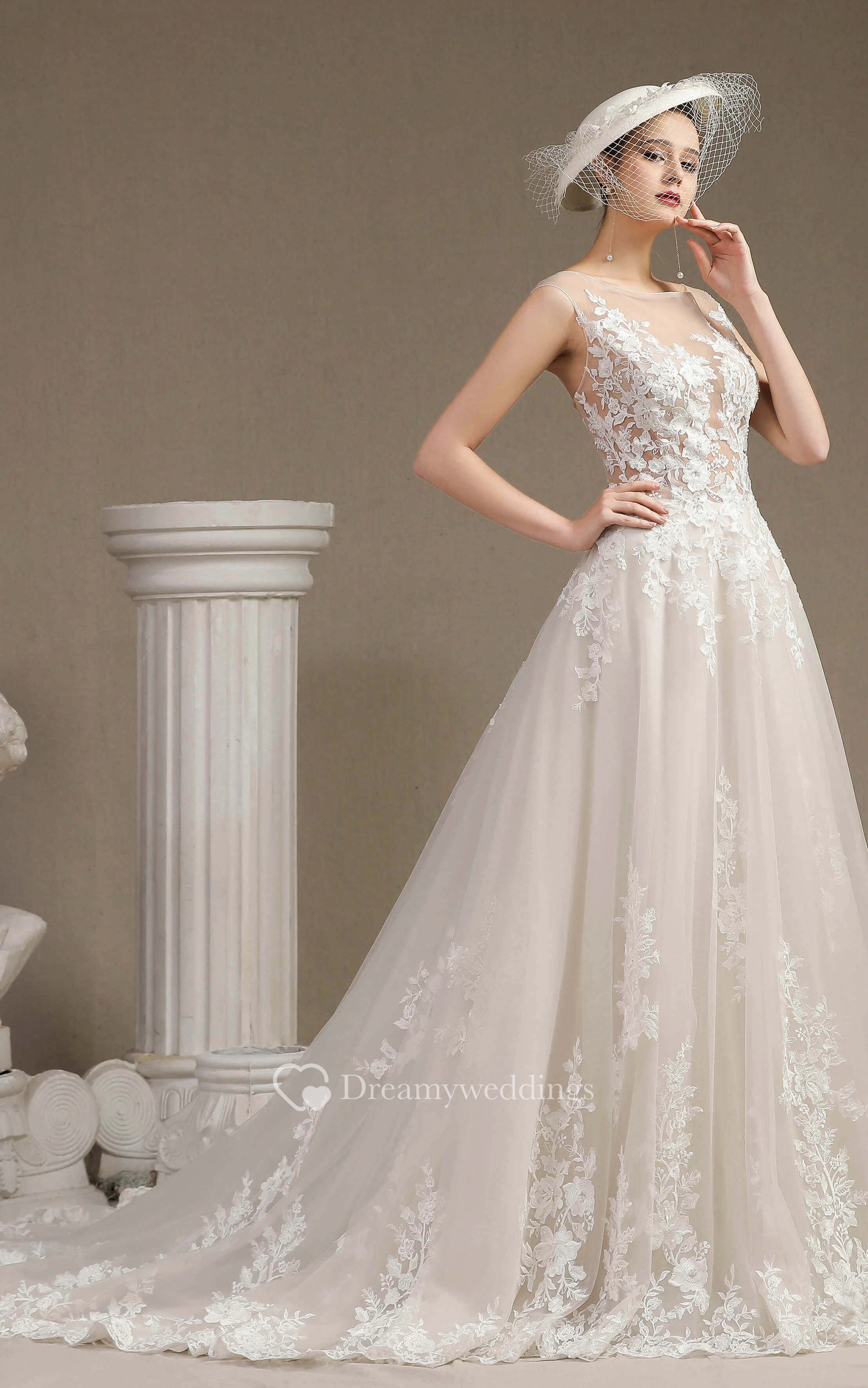 Cap Sleeve Illusion Top Ballgown Wedding Dress With Lace Appliques And Button Back