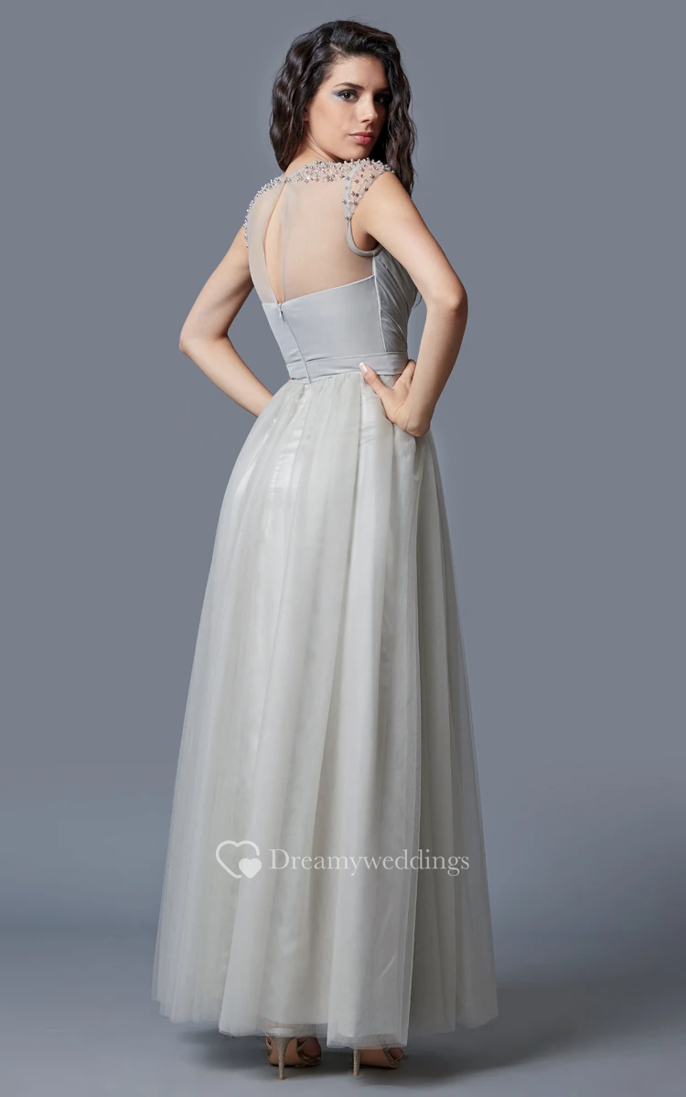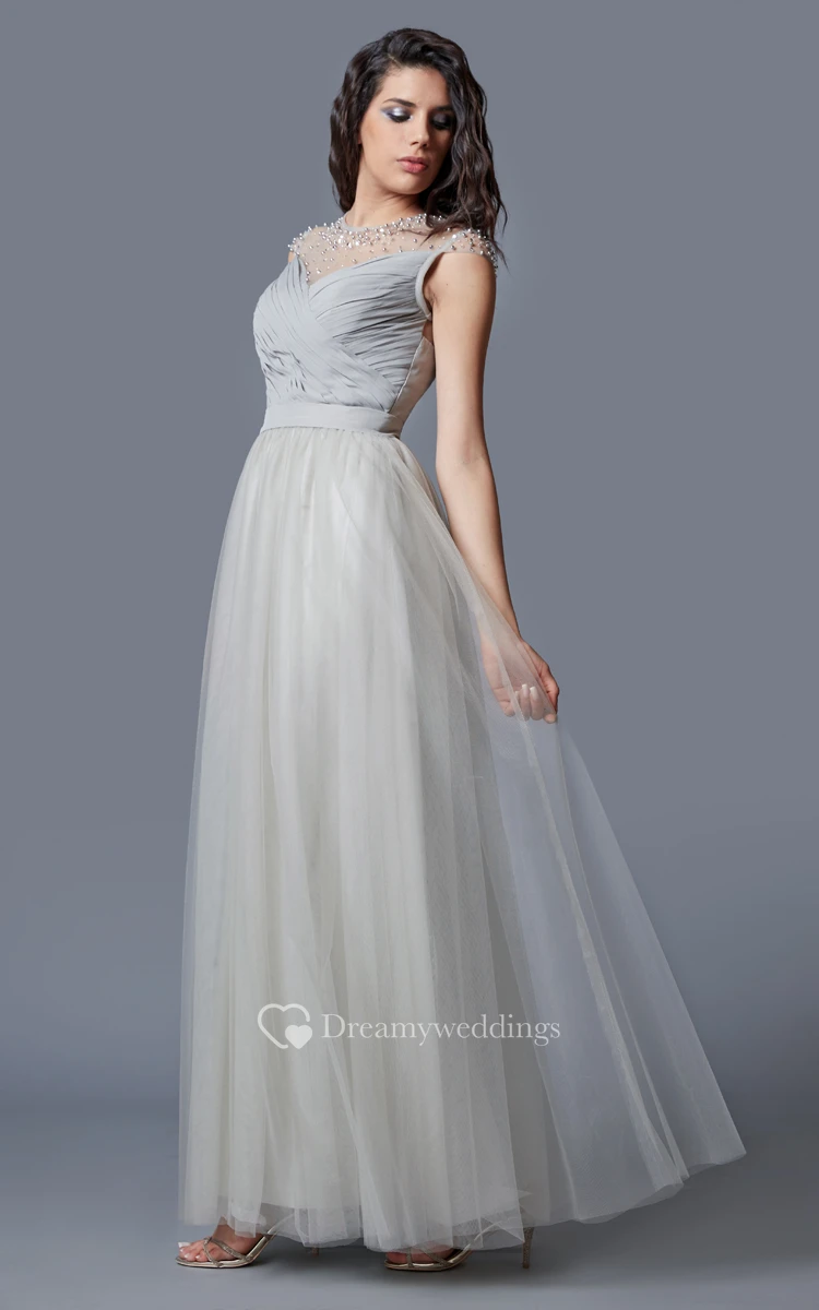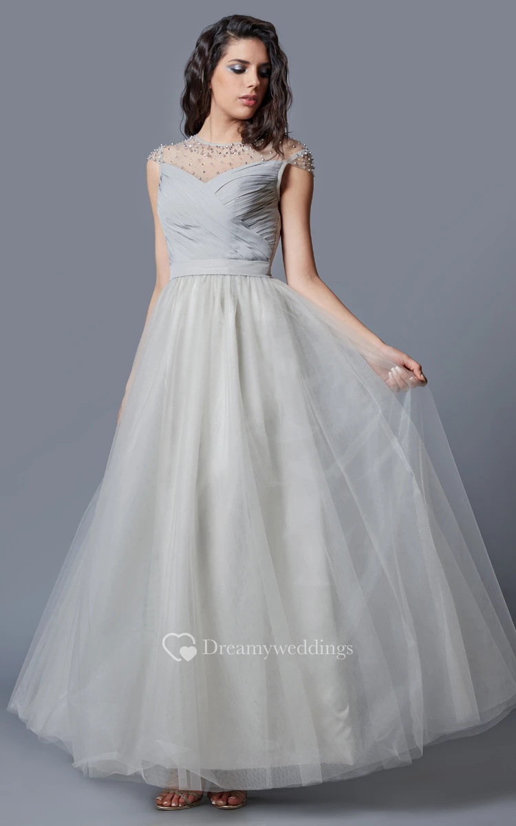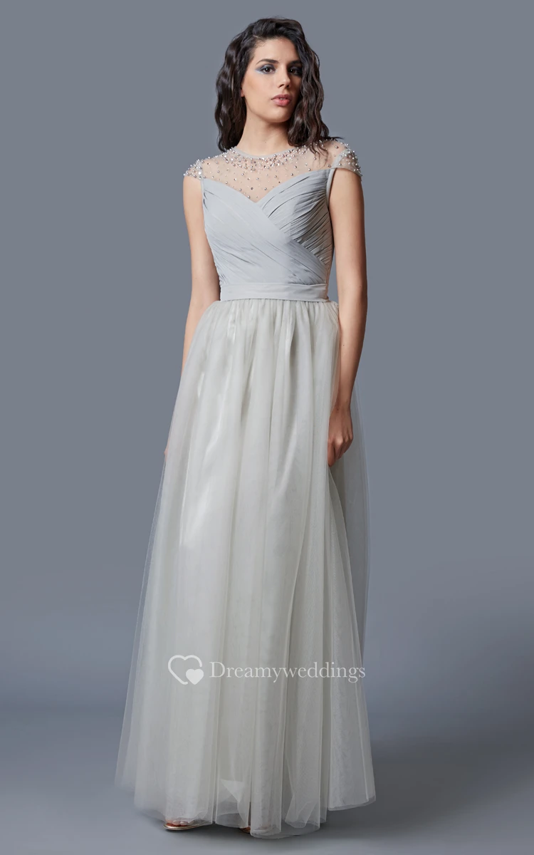 Cap Sleeve Jewel Neck Ruched Long Tulle Dress With Beading