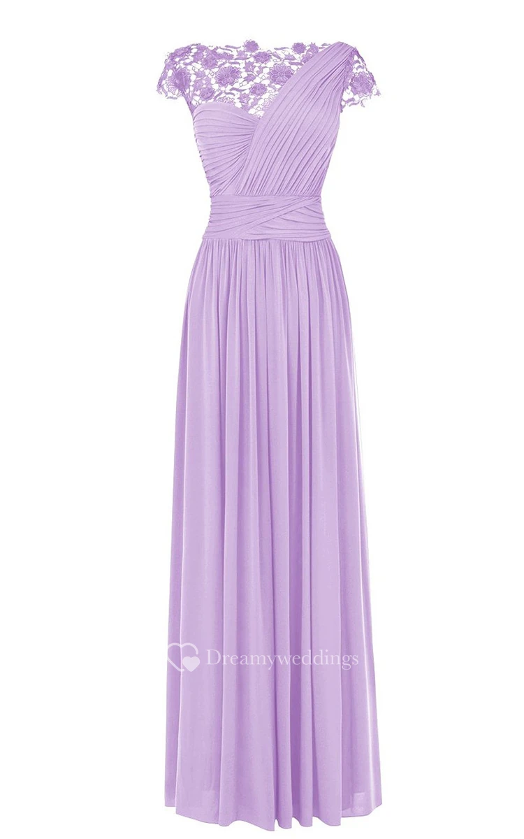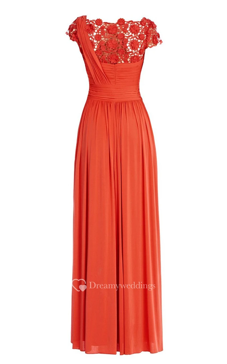 Cap-sleeve Ruched A-line Dress With Lace Appliques