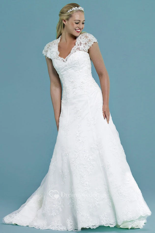 Cap-Sleeve V-Neck Appliqued Long Lace Wedding Dress
