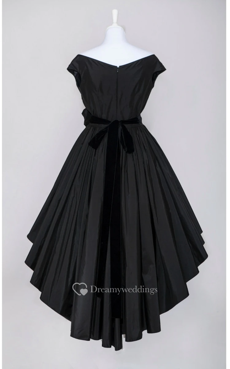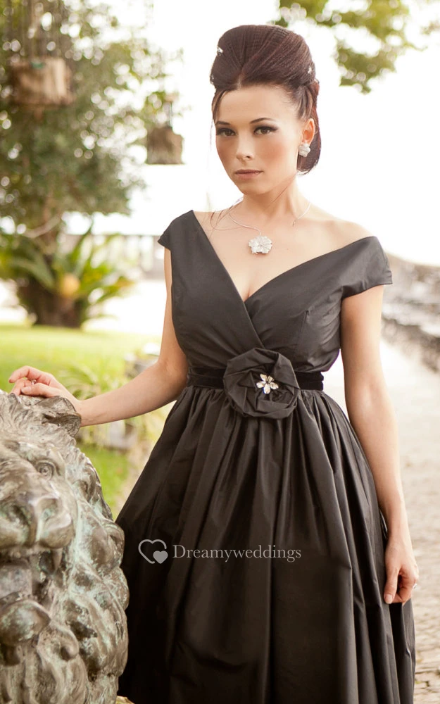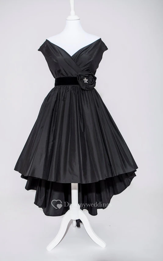 Cap-sleeve V-neck High Low Satin Dress With Flower and Pleats