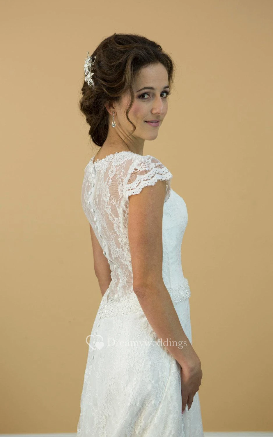 Cap Sleeve V-Neck Lace Dress With Illusion Back and Scalloped-Edge Hemline