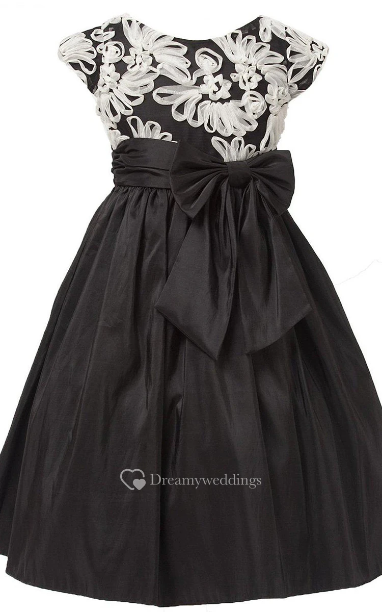 Cap-sleeved A-line Appliqued Dress With Bow and Pleats