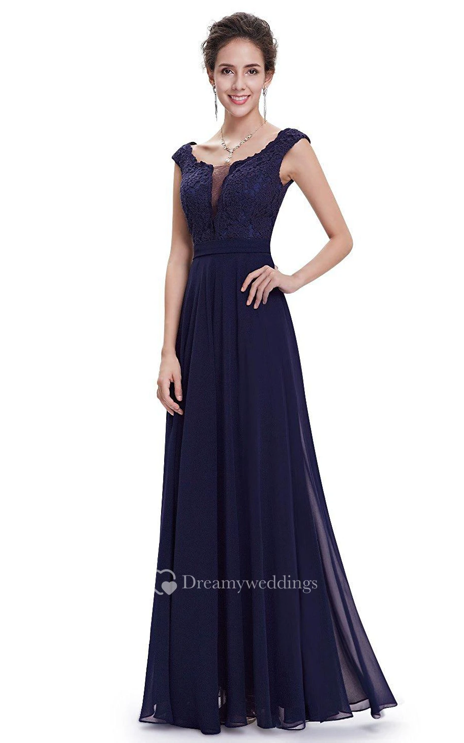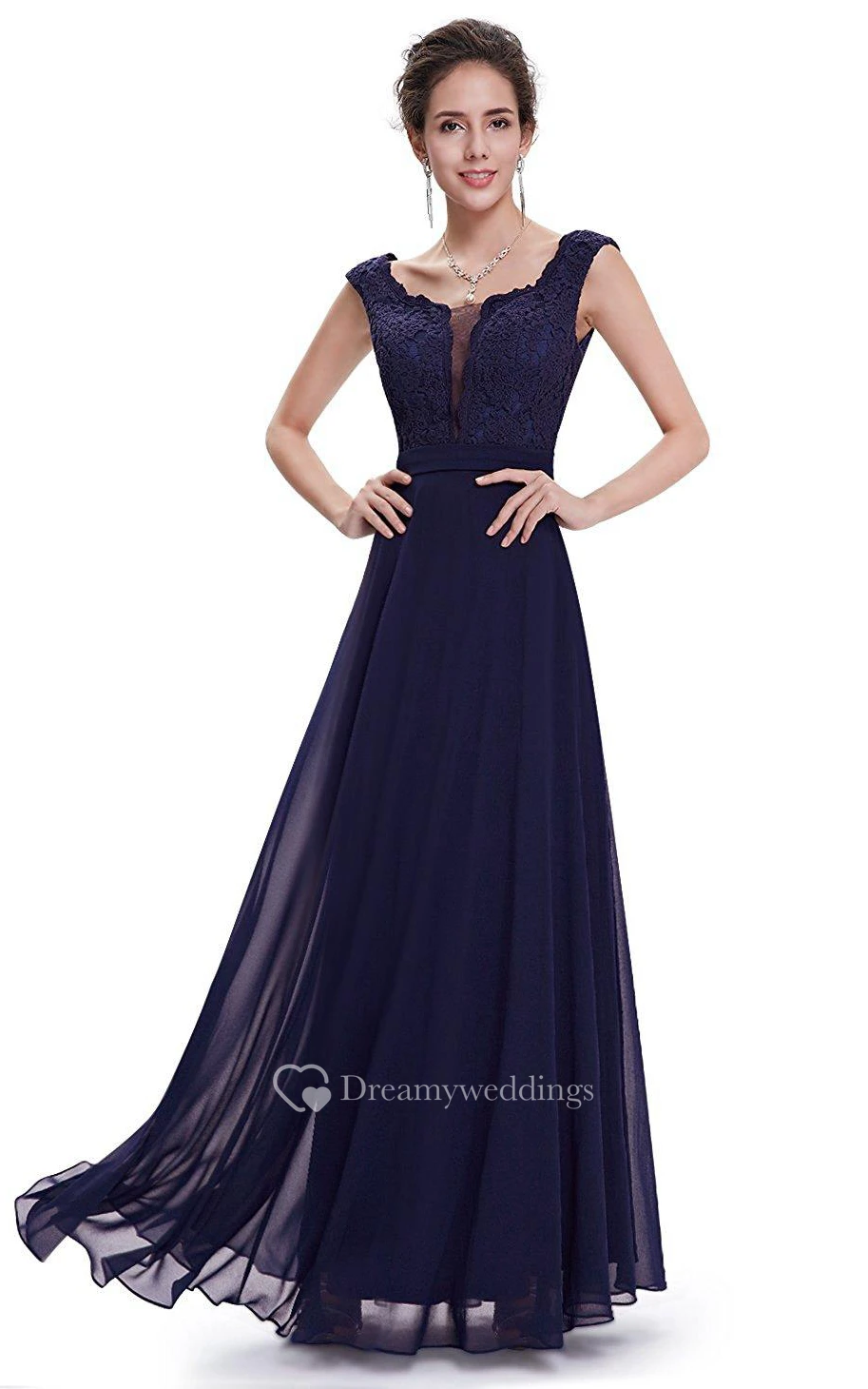 Cap-sleeved A-line Floor-length Chiffon Dress with Lace Bodice
