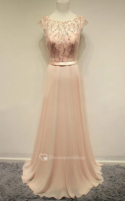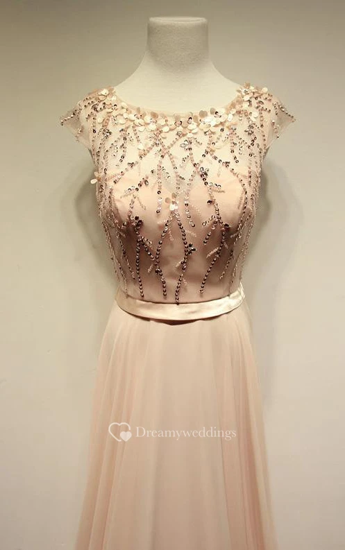 Cap-sleeved A-line Long Dress with Beadings and Pleats