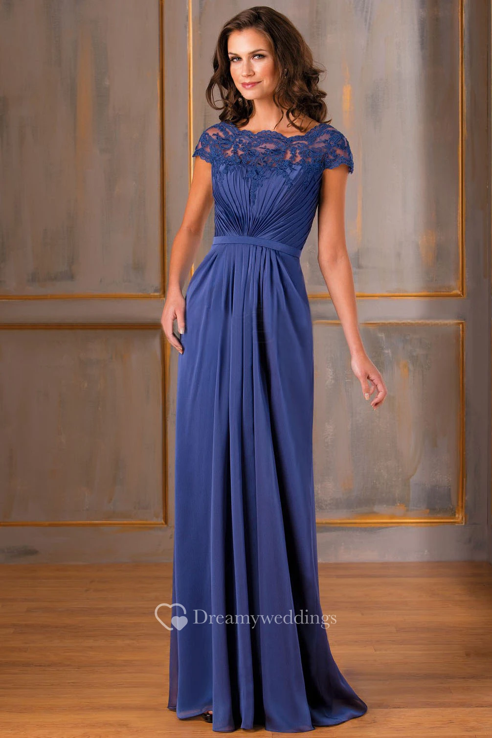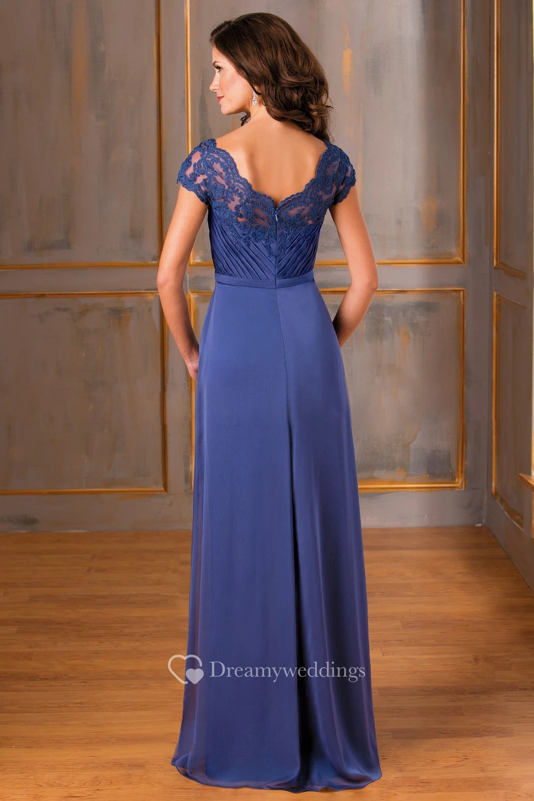 Cap-Sleeved A-Line Long Gown With Lace Appliques And V-Back