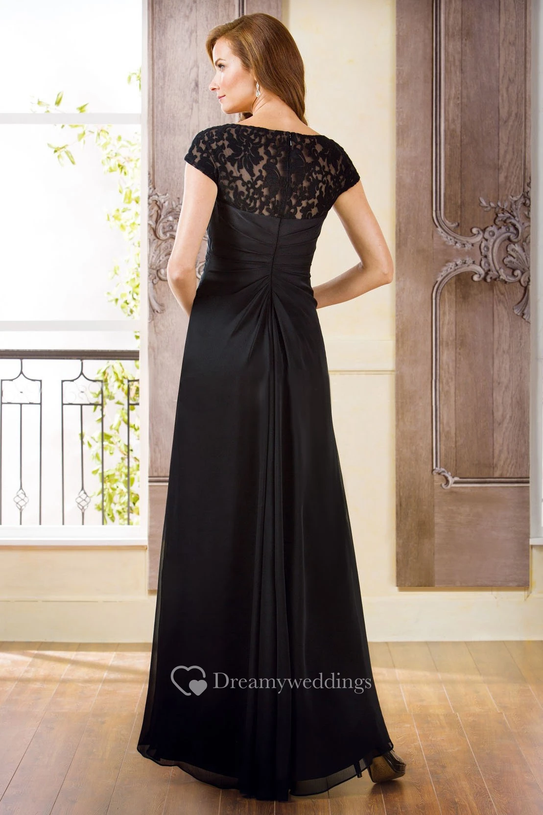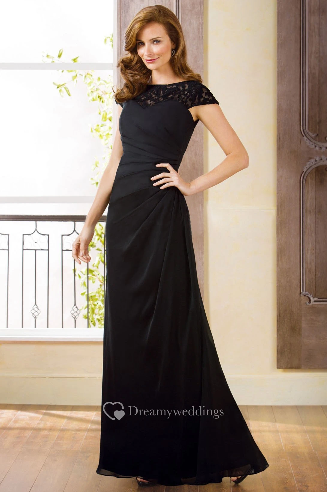 Cap-Sleeved Bateau-Neck Long Mother Of The Bride Dress With Lace Detail