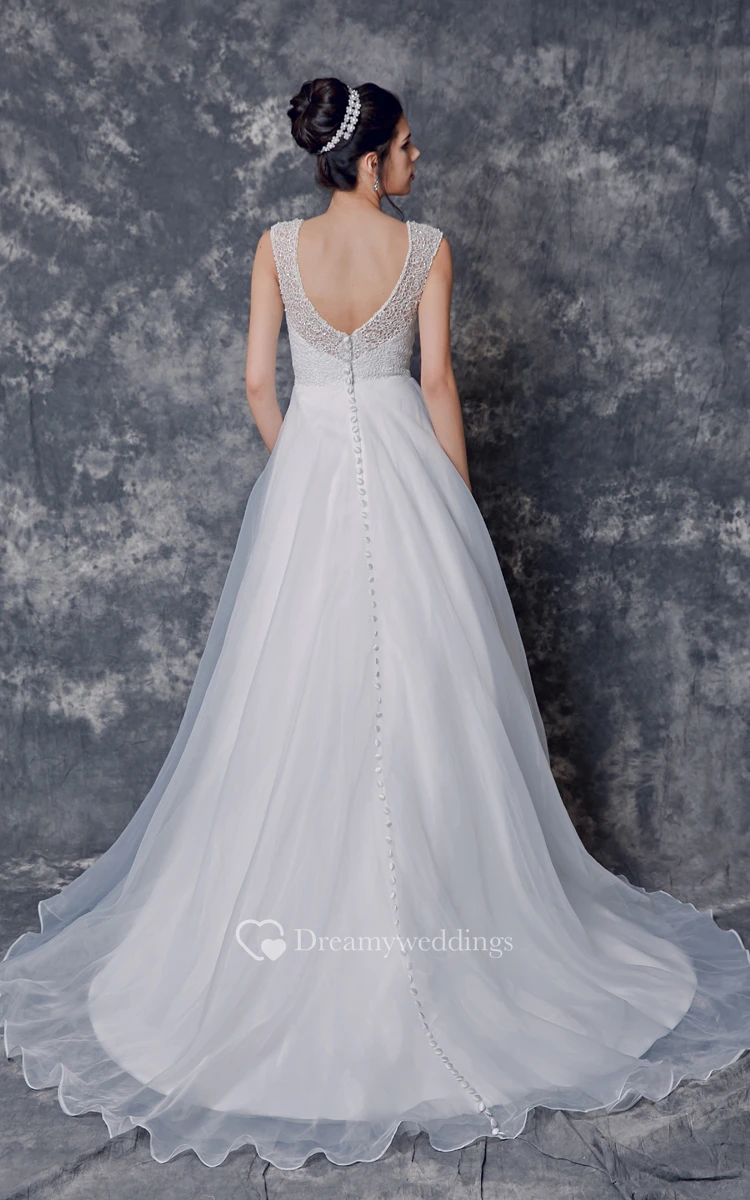 This exquisite A-line gown will wow your wedding guests. The bodice has a V-neck with cap sleeves that sit slightly off the shoulder, and a low V in the back. The voluminous organza skirt is floor-length with a brush train. The dress pulls in at the natural waist and the bodice is made of an intricate lace pattern with subtle beaded detail.