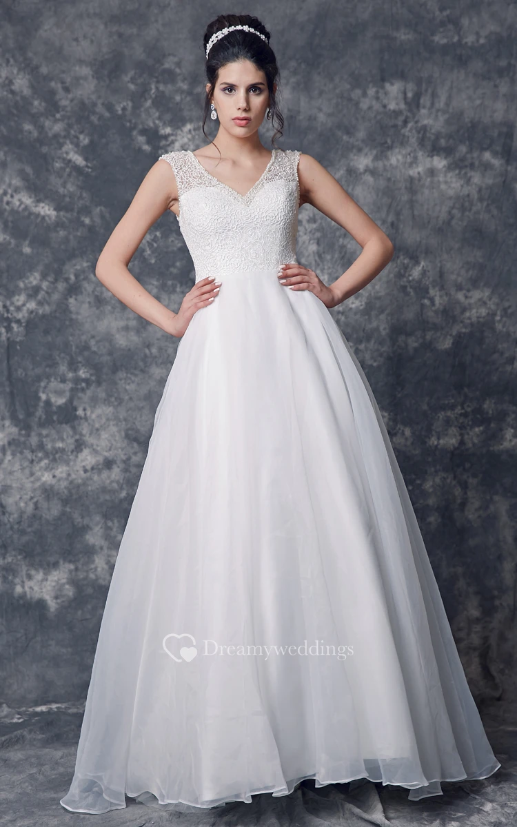 Cap Sleeved Beaded V Neck Organza Ball Gown With Lace Bodice