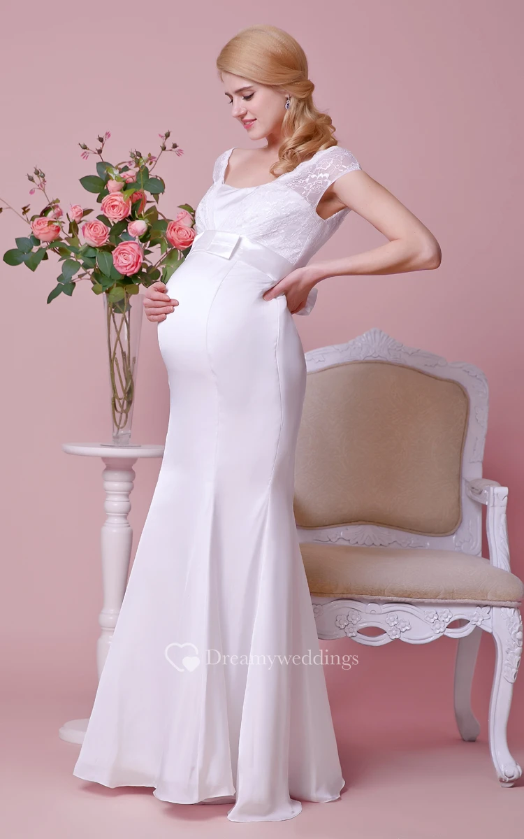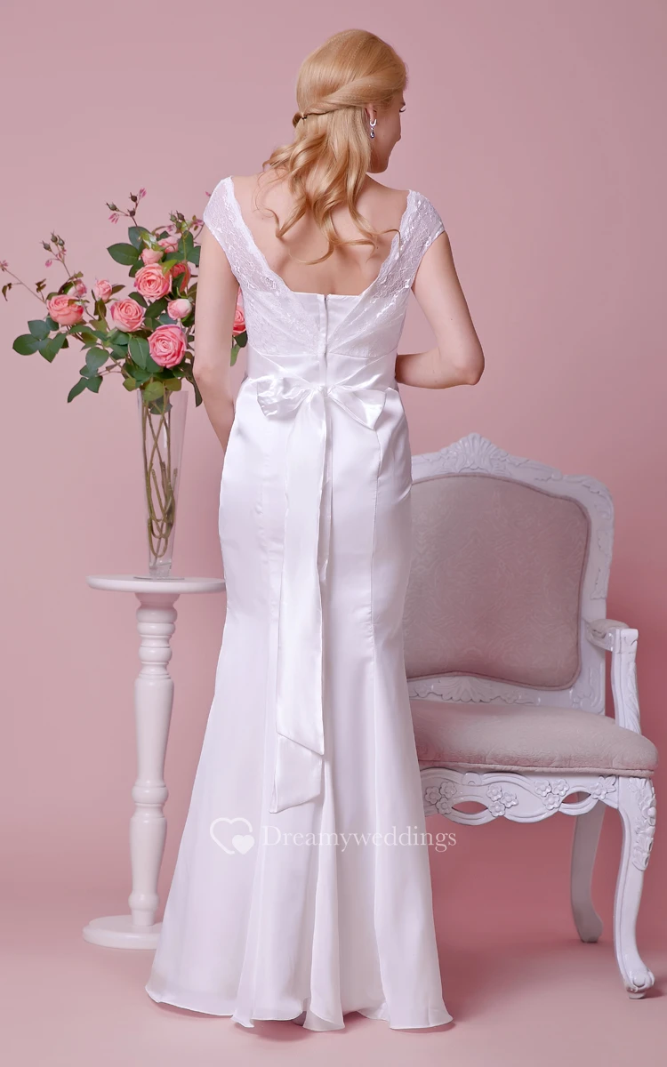 Cap-sleeved Empire Mermaid Satin Long Dress With Bows and Lace Bodice