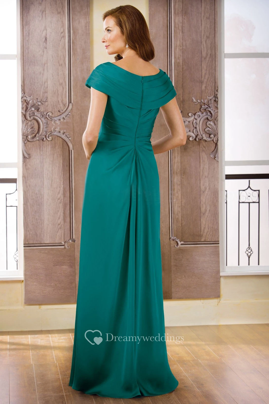 Cap-Sleeved Long Gown With Side Slit And Jeweled Neck