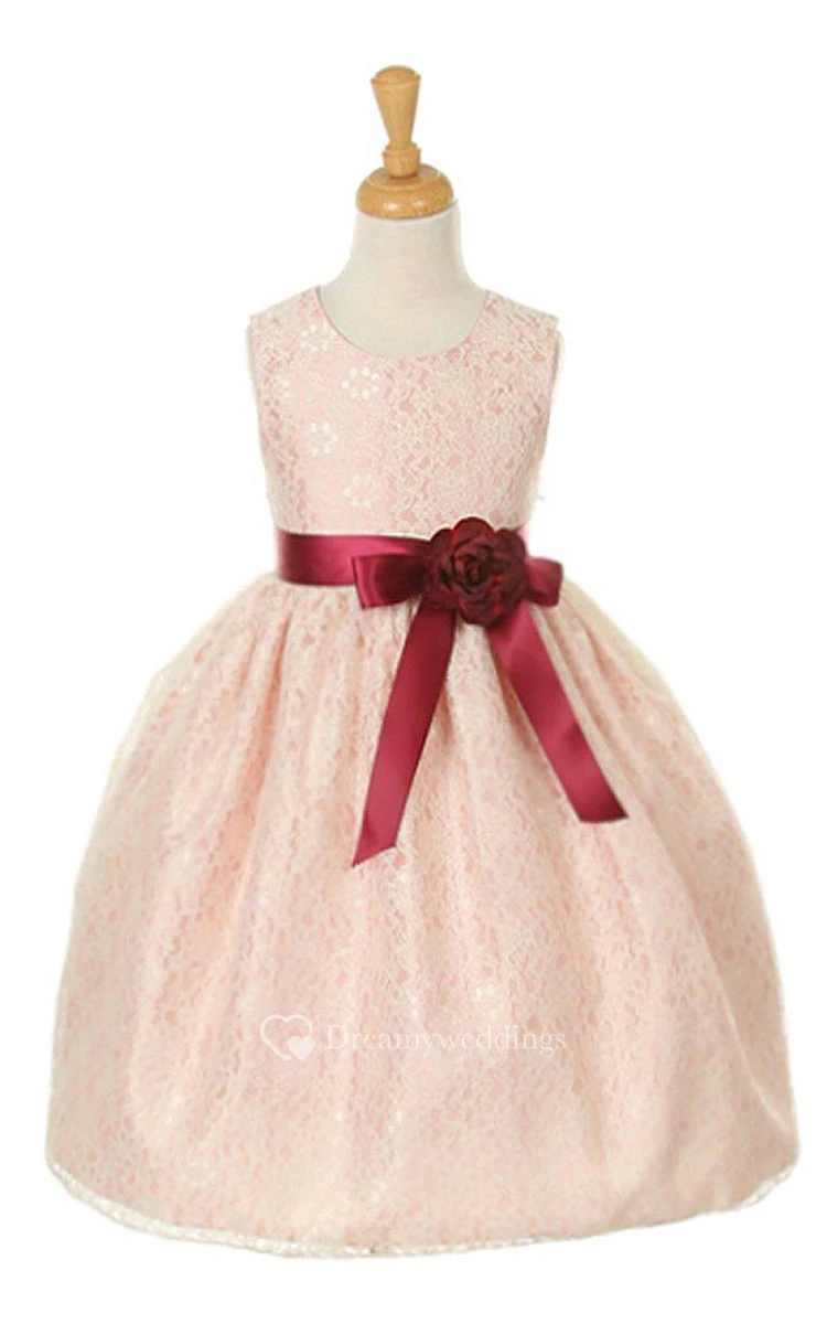 Cap-sleeved Scoop-neck A-line Lace Dress With Belt