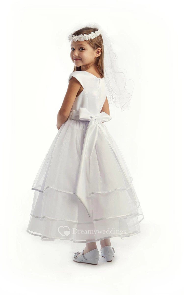 Cap-sleeved Scoop-neck A-line Tiered Organza Dress With Beadings