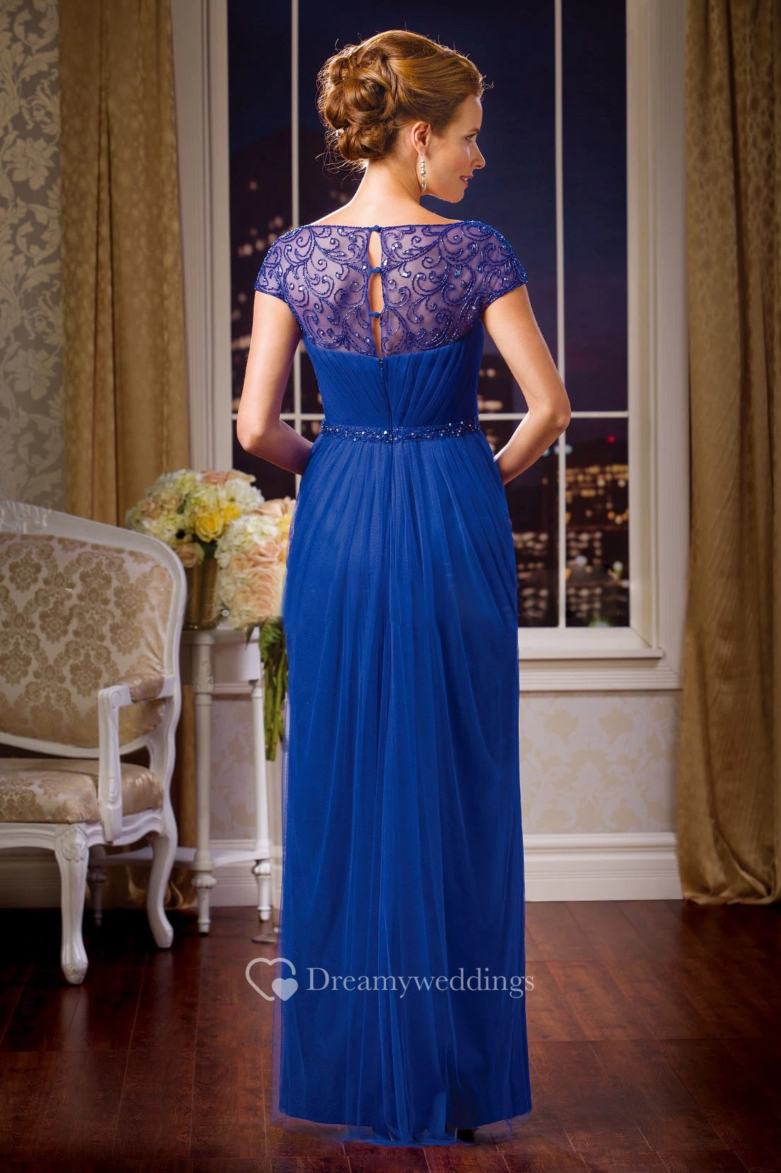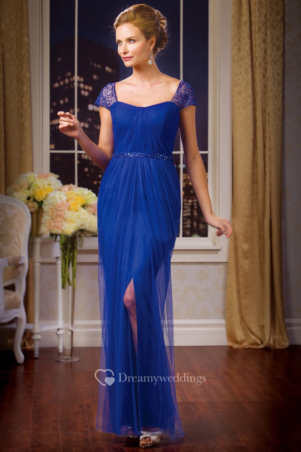Cap-Sleeved Square-Neck Mother Of The Bride Dress With Front Slit And Sequins