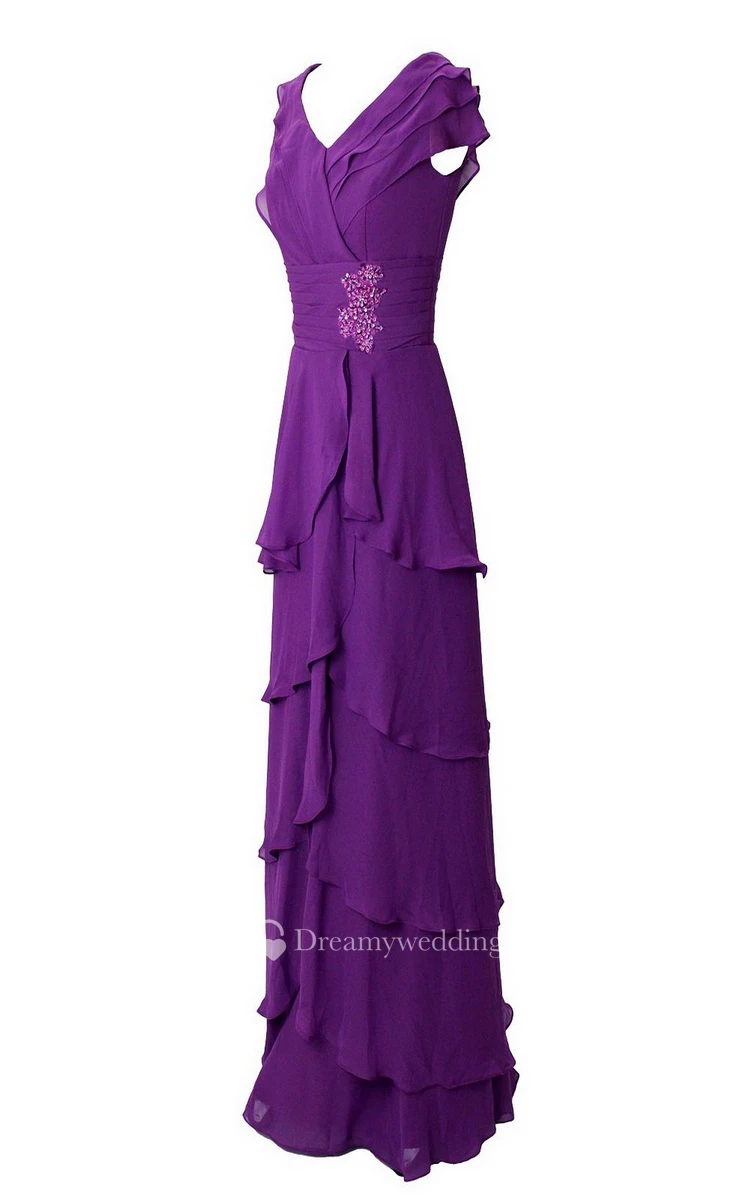 Cap-sleeved Tiered Long Chiffon Dress With Sequins