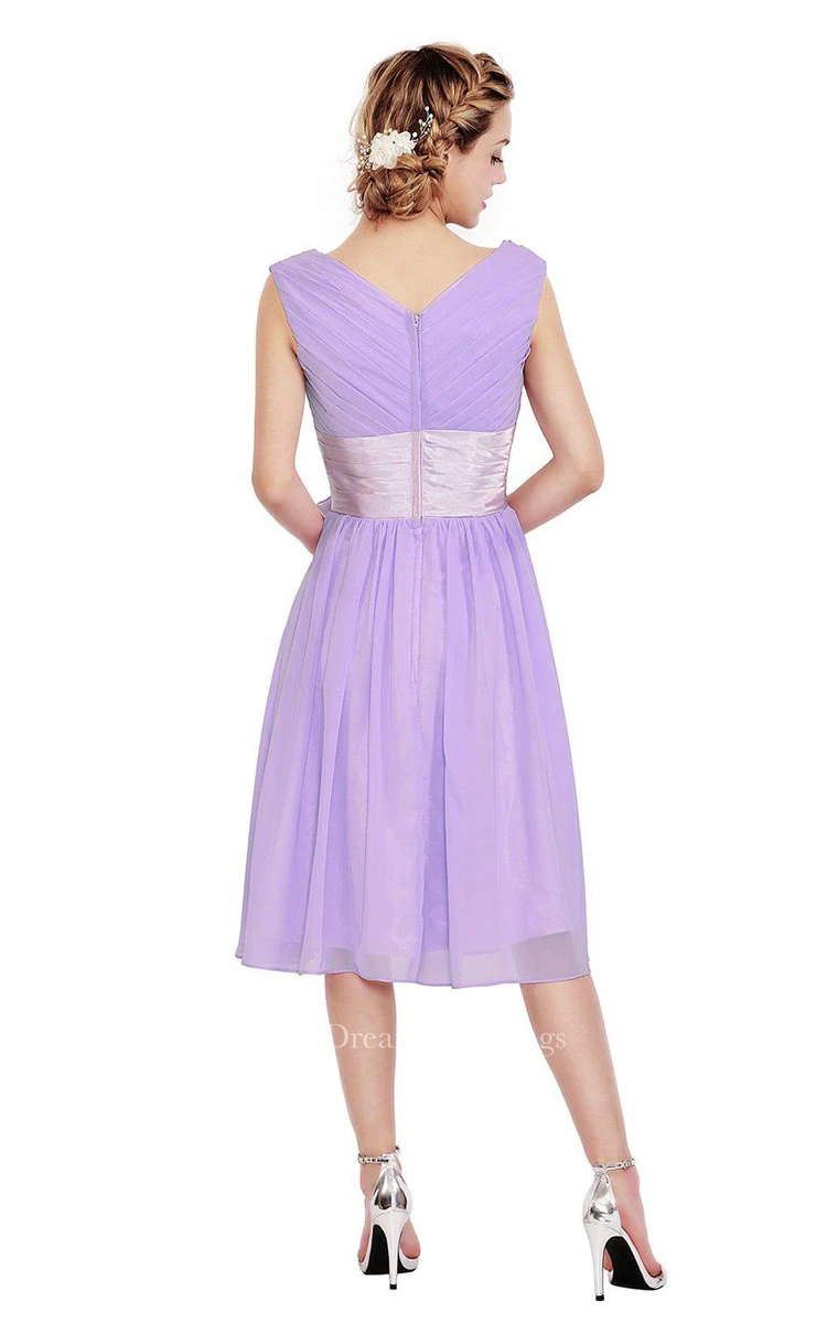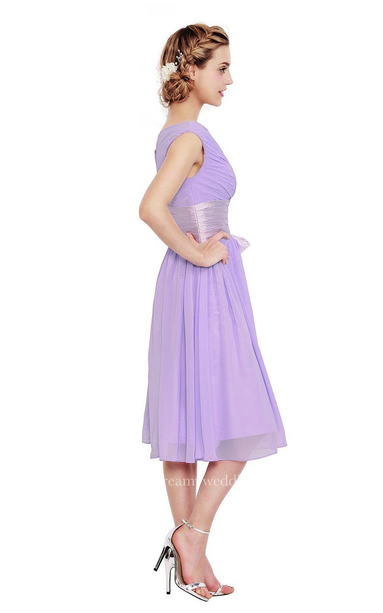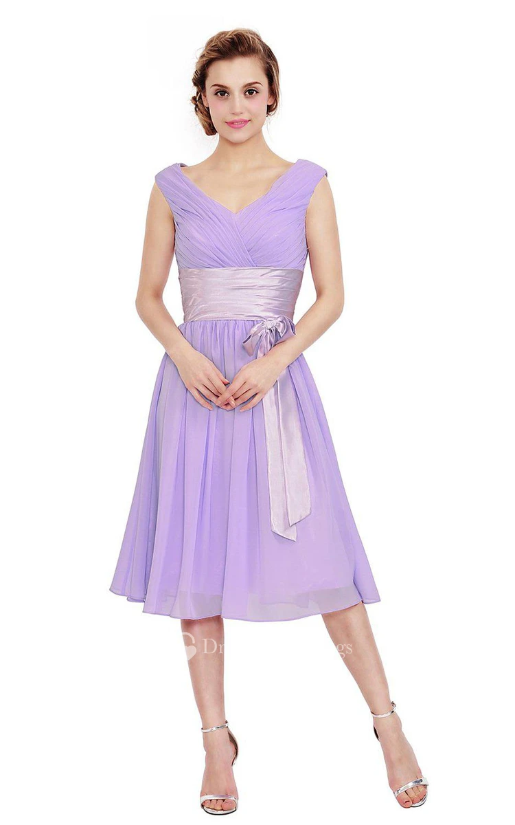Cap-sleeved V-neck A-line Dress With Bow and Pleats