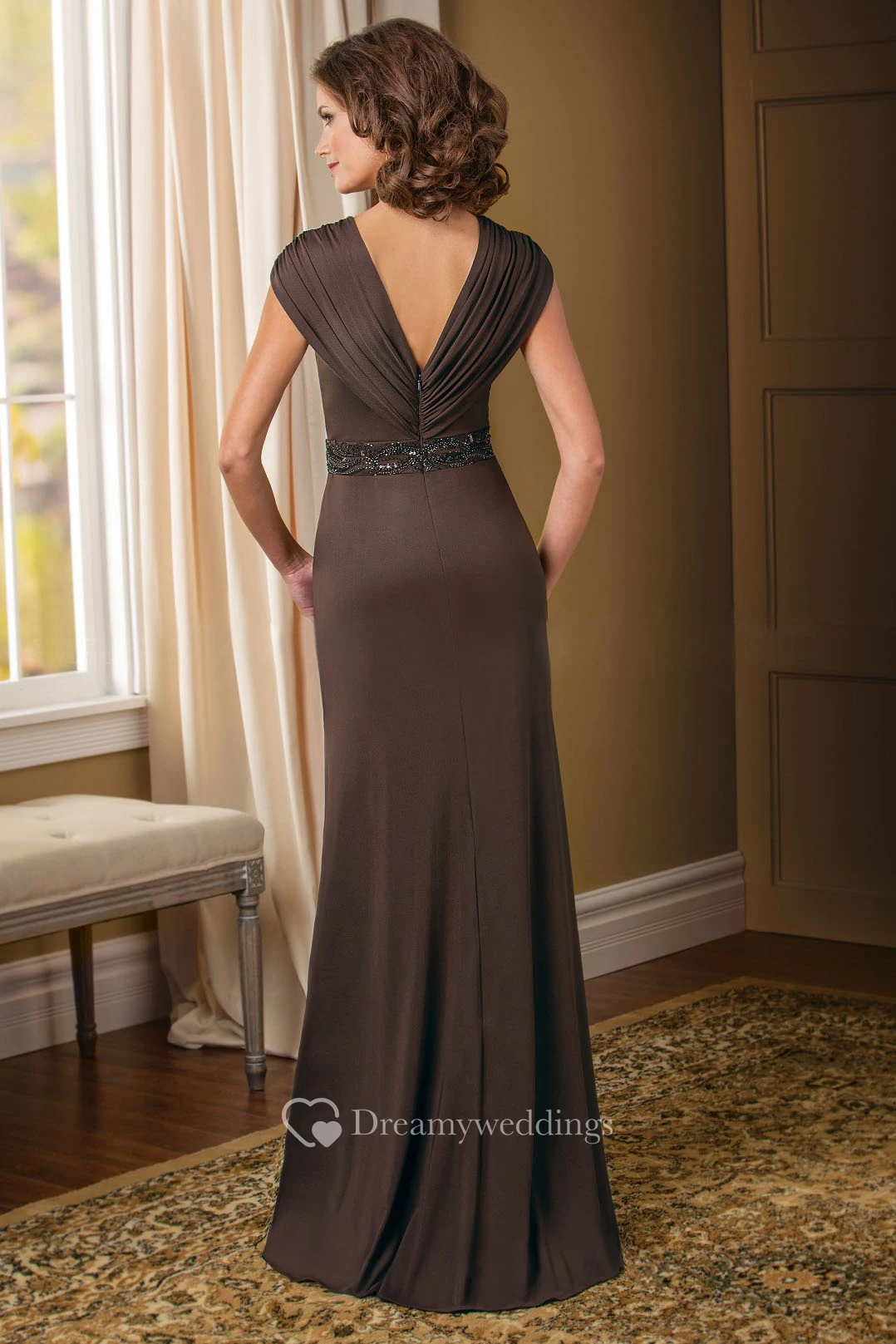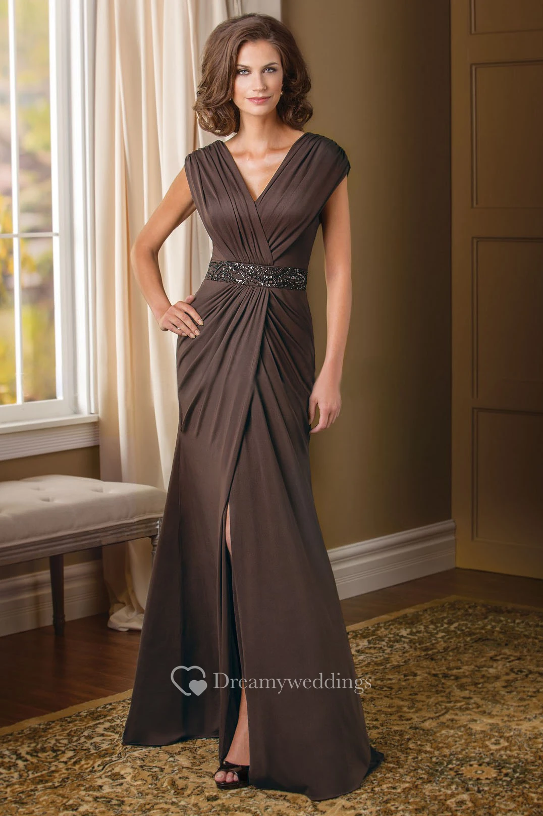 Cap-Sleeved V-Neck Mother Of The Bride Dress With Front Slit And Sequins