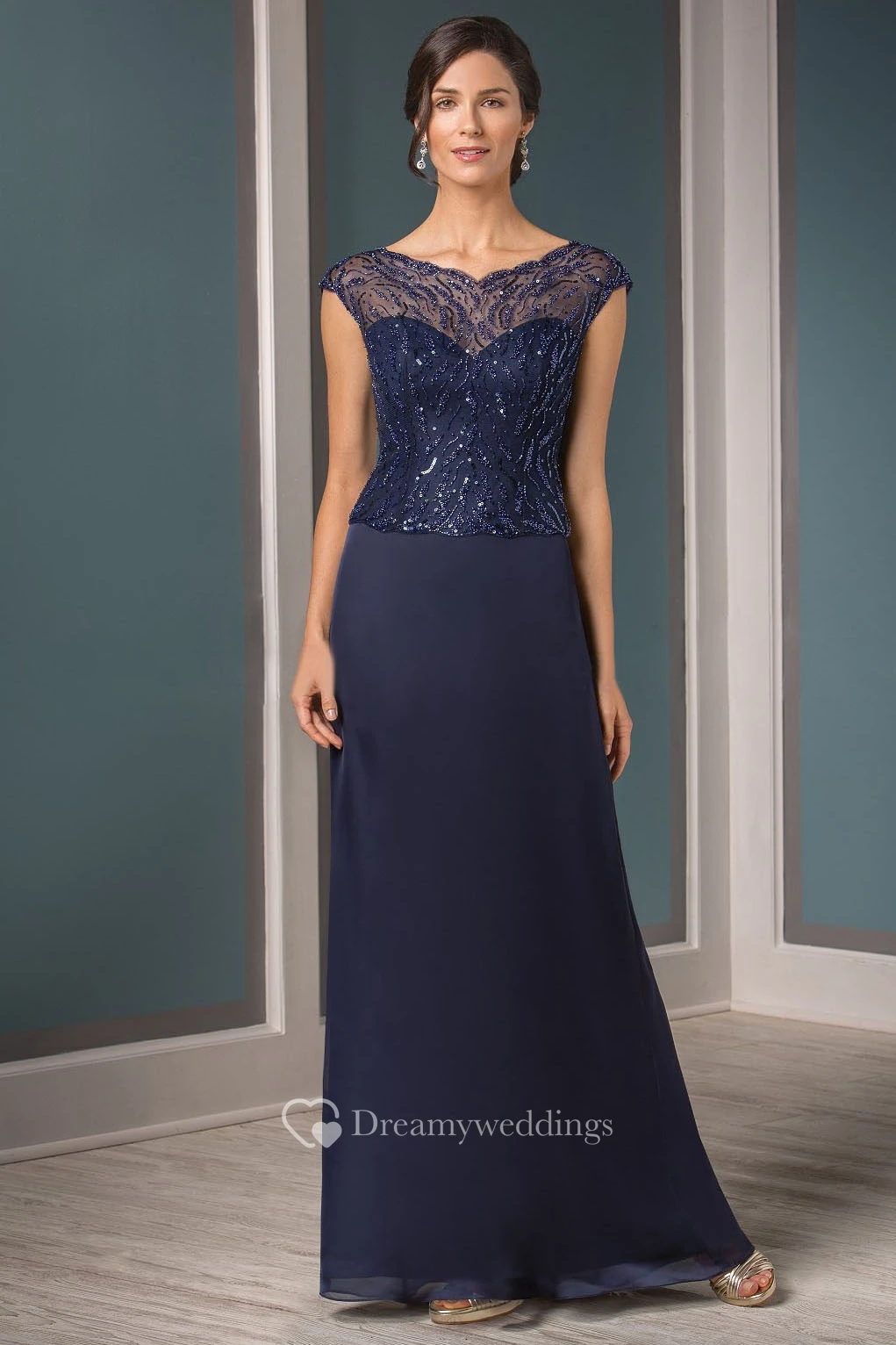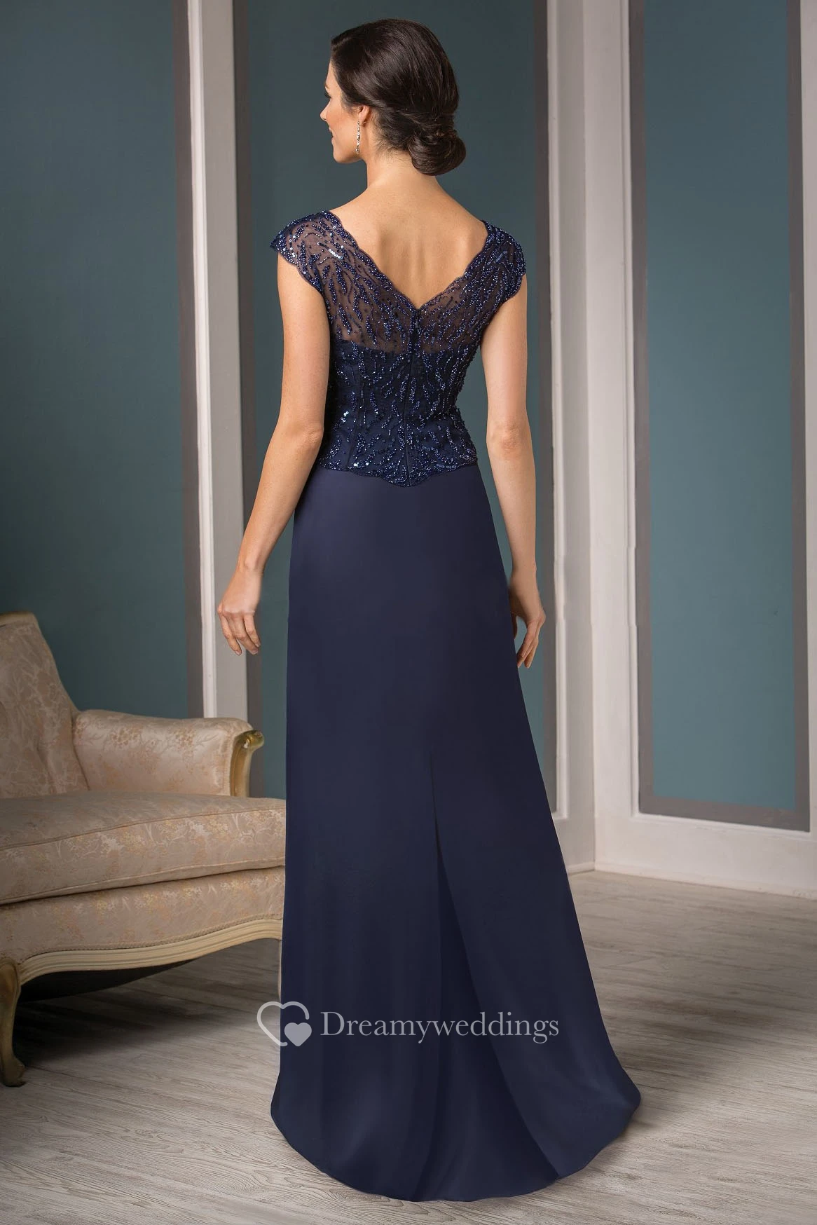 Cap-Sleeved V-Neck Mother Of The Bride Dress With Sequins And Illusion Style