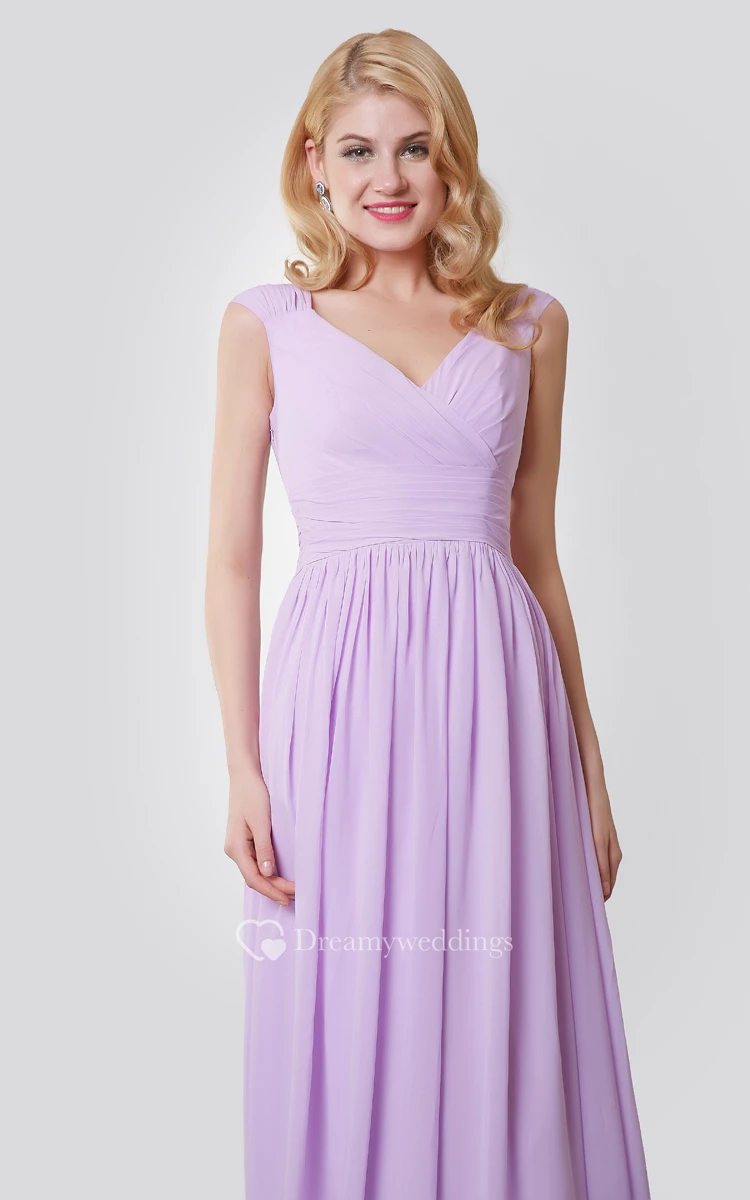 This vintage-style chiffon gown is elegant and timeless. The bodice is ruched with a shallow V-neck and cap sleeves. It meets the floor-length skirt at the natural waist. This A-line dress has a more billowing skirt than most, adding a little bit of volume to your silhouette. The dress is tied in the back with a wide chiffon bow.