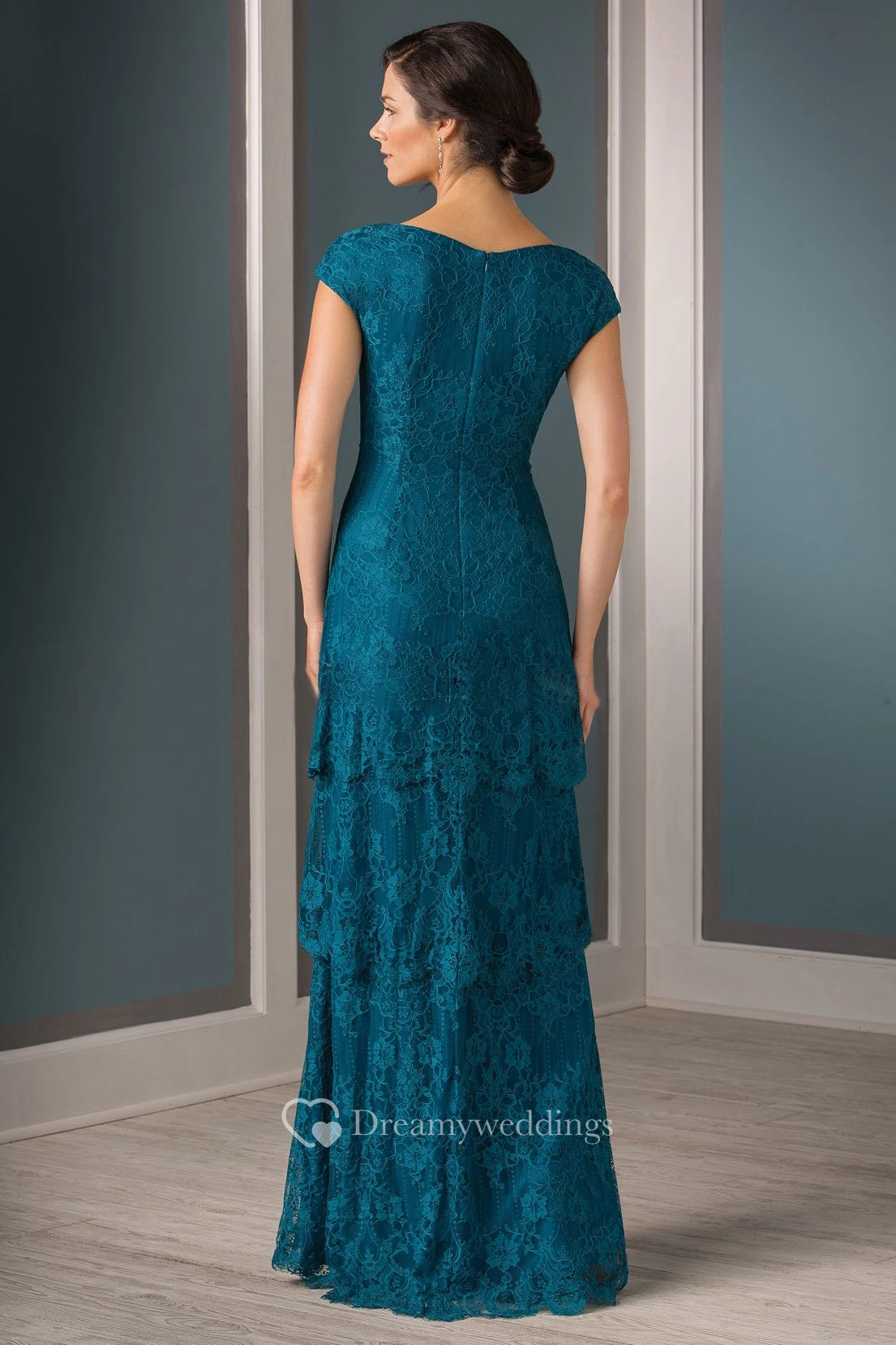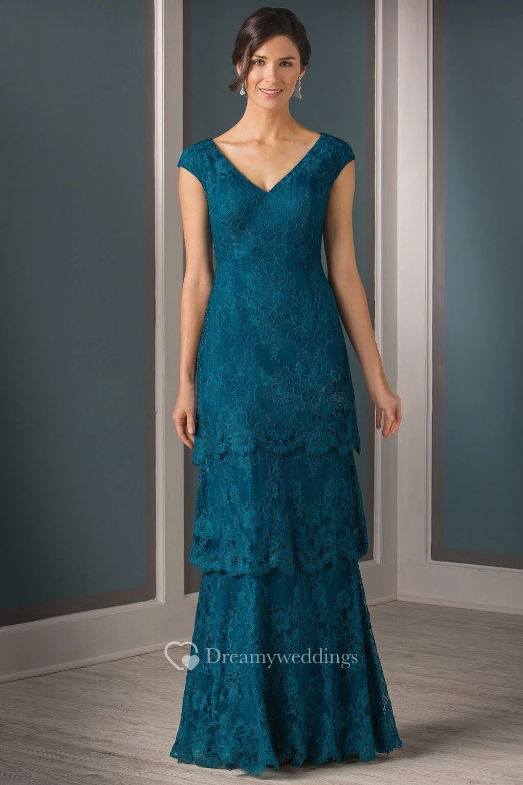Cap-Sleeved V-Neck Tiered Lace Mother Of The Bride Dress With Pleats