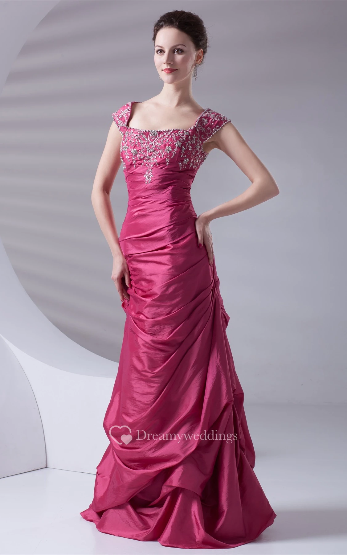 Caped-Sleeve Pick-Up A-Line Taffeta Gown With Embroideries