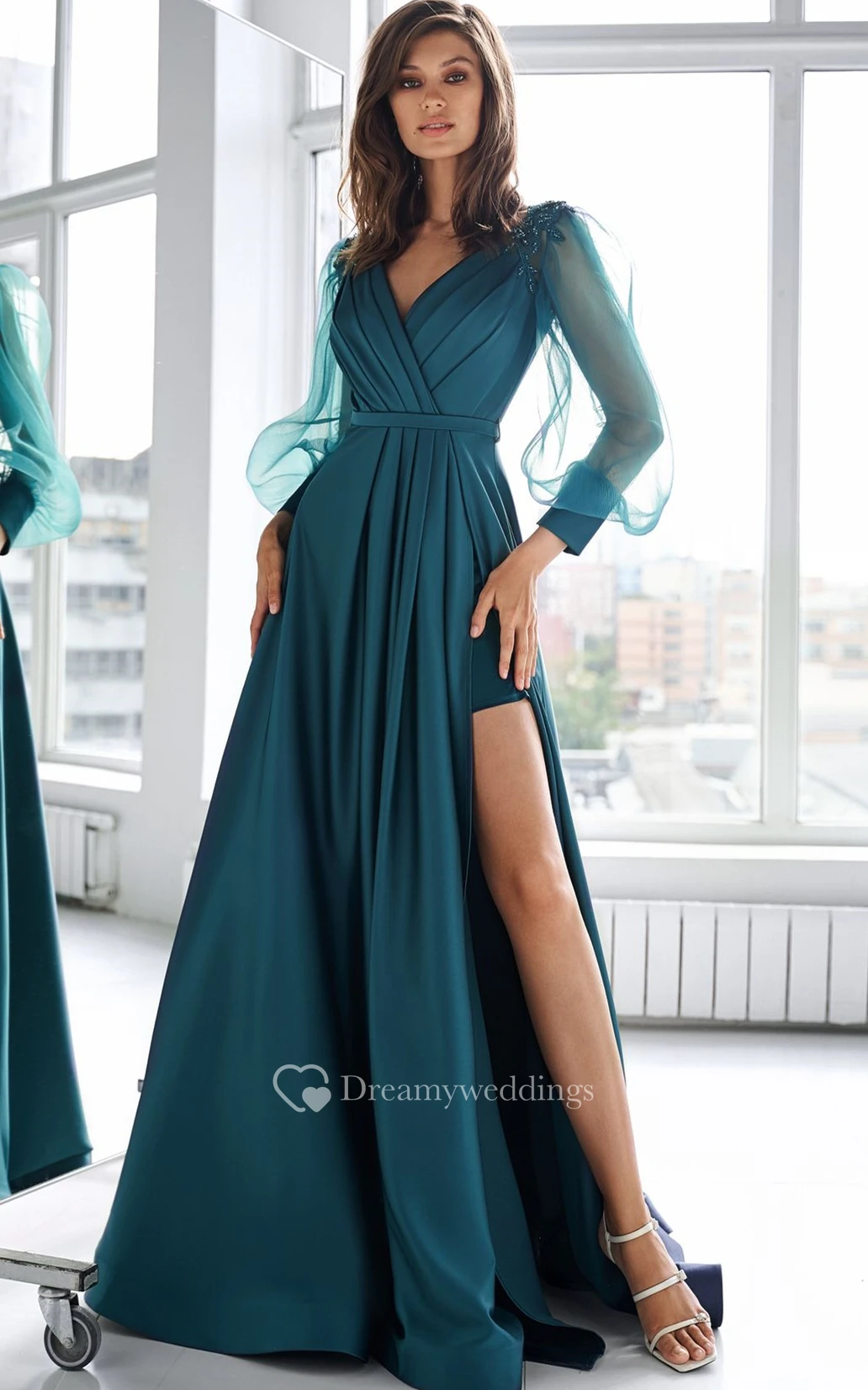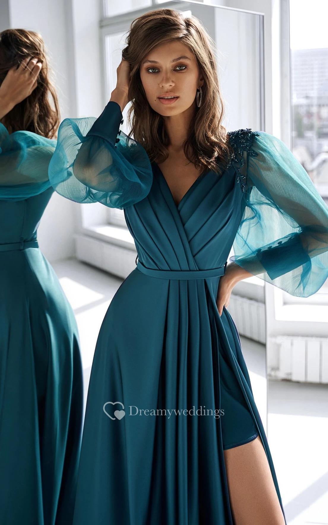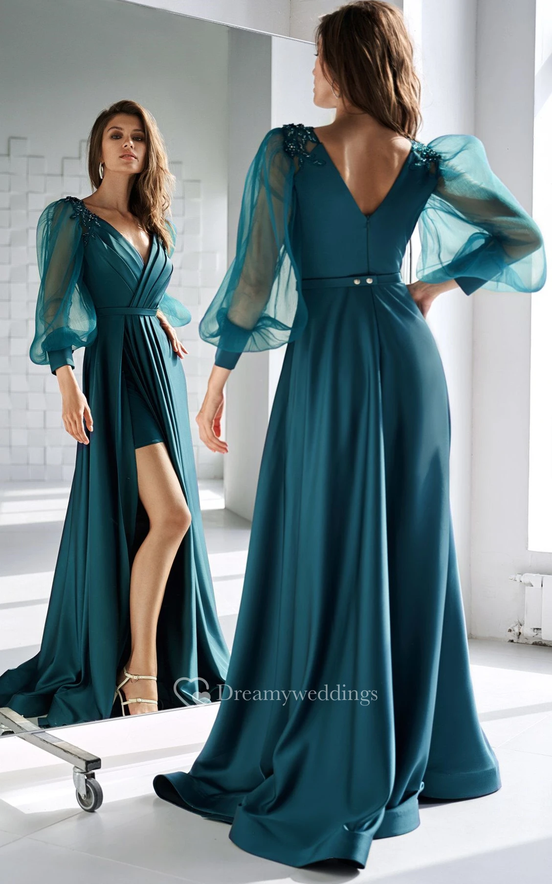 Casual V-neck A Line Satin Floor-length Prom Dress with Ruching and Split Front