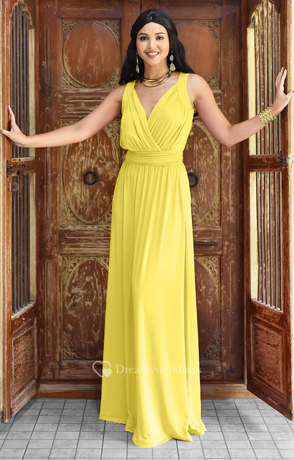Casual V-neck A Line Sleeveless Floor-length Chiffon Bridesmaid Dress With Ruching