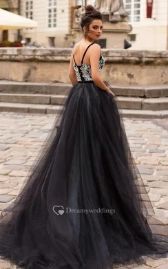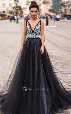 Casual V-neck A Line Tulle Floor-length Sleeveless Prom Dress with Appliques
