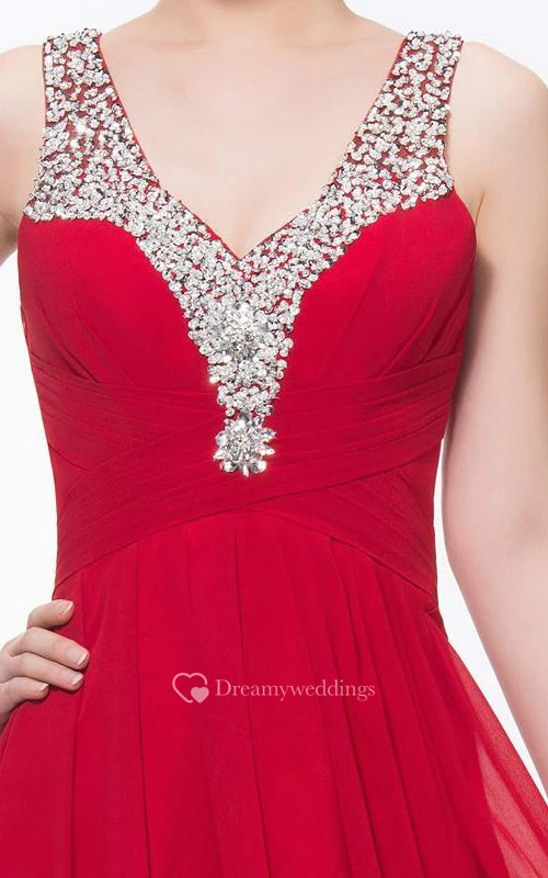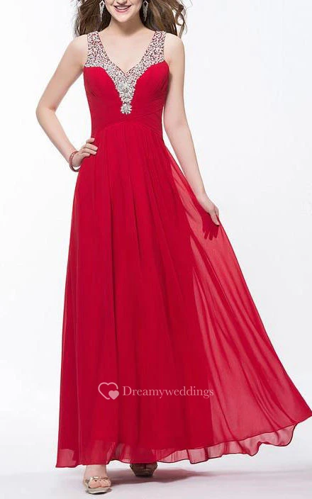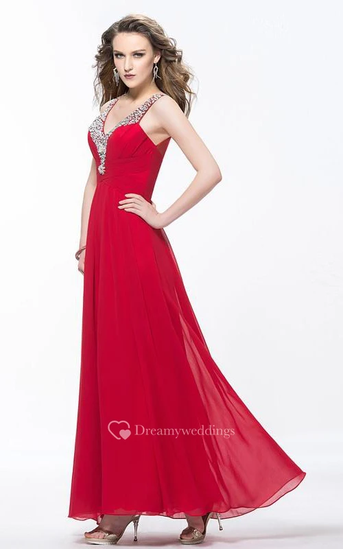 Charming V Neck Squins Ruffles Beading Ankle Length Prom Dress