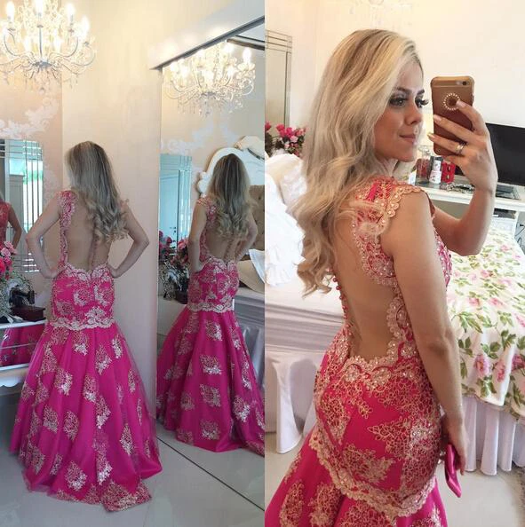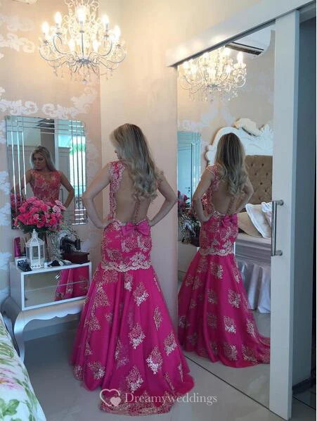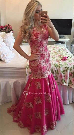 Chic Lace Appliques Mermaid Sequins Prom Dress Fuchsia Sweep Train