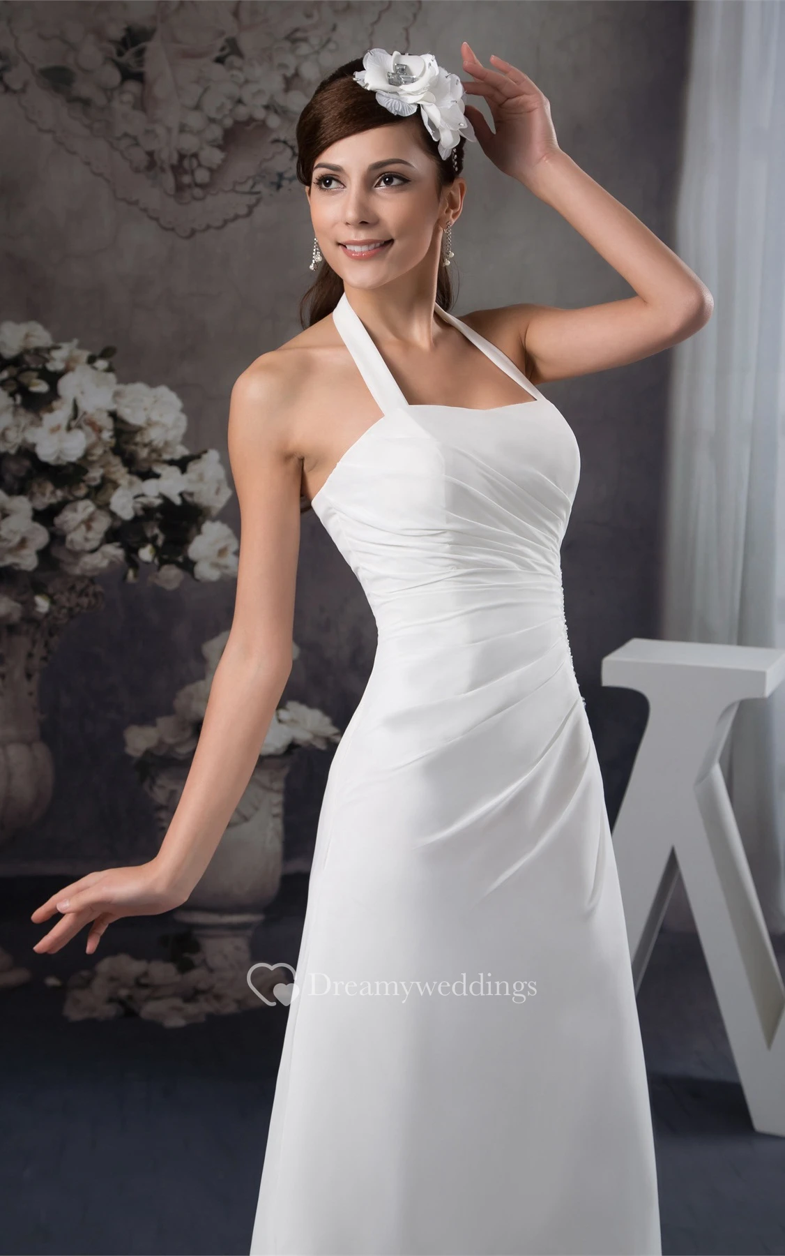 Chiffon A-Line Floor-Length Side-Draped Halter and Dress With Appliques