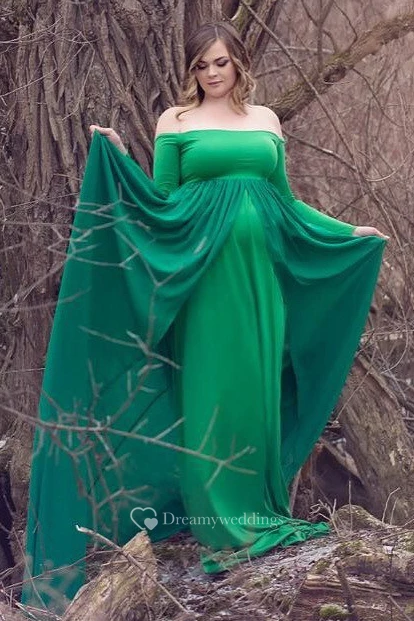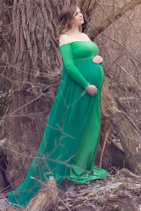 Chiffon Jersey A-line T-shirt Long Sleeve Off-the-shoulder Maternity Dress