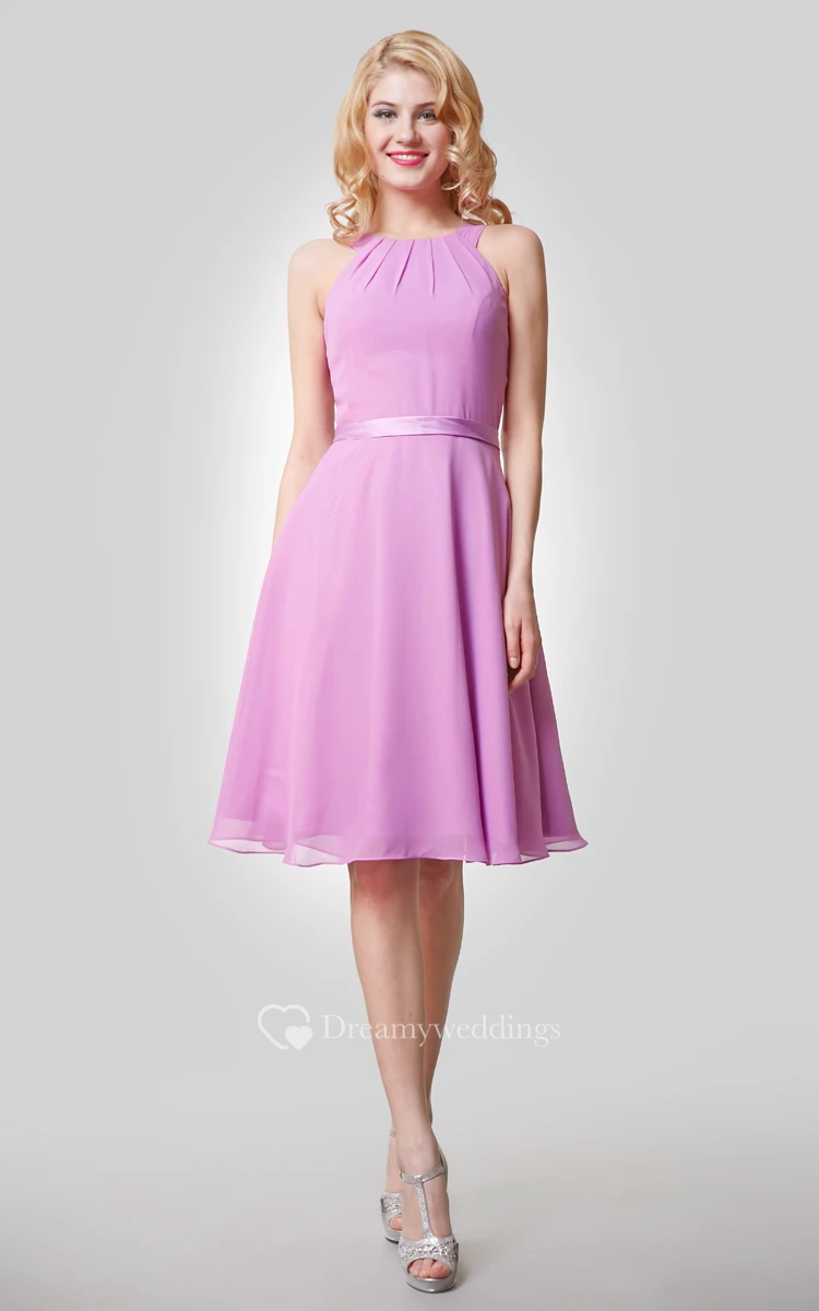This delicate chiffon dress is classy and elegant. The A-line dress has a knee-length skirt, and is pulled in at the waist with a simple satin belt that ties in the back. The dress has a high neckline with thick straps that reach around the collar bones. Pleats at the neckline give this dress a stylish vintage appeal.