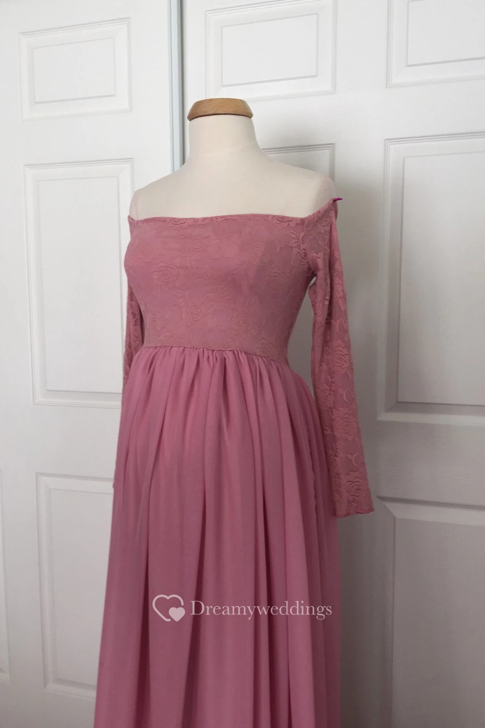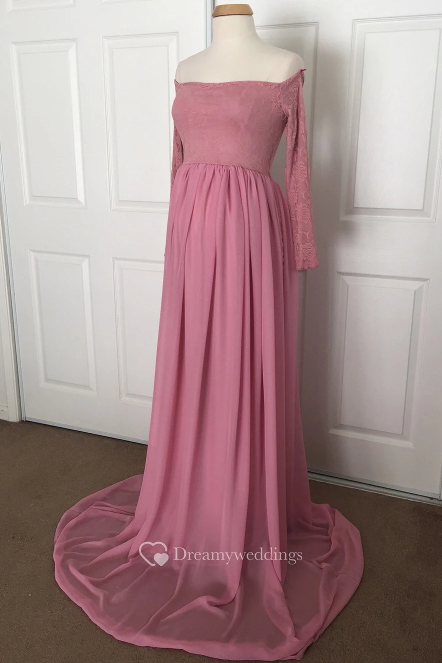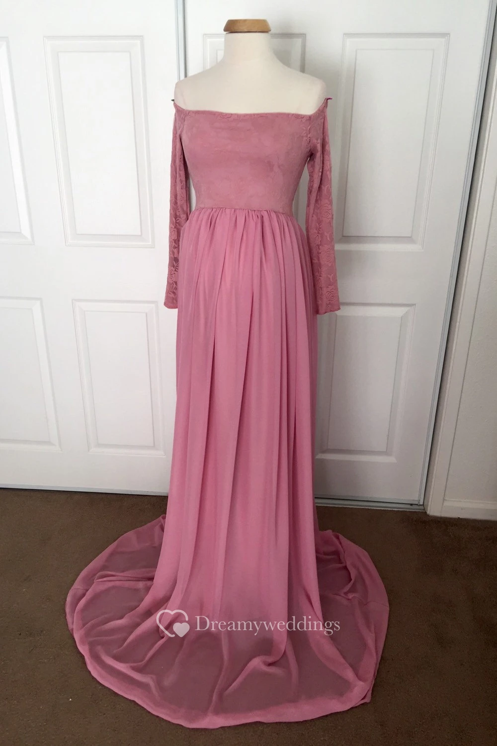 Chiffon Lace A-line Illusion Long Sleeve Off-the-shoulder Maternity Dress
