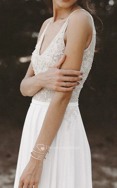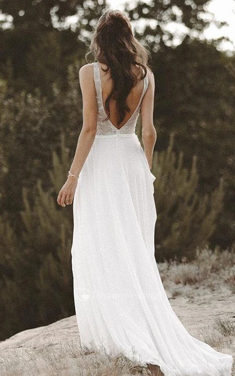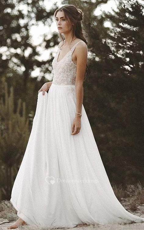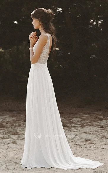 Chiffon Lace Brush Train A Line Sleeveless Bohemian Wedding Dress with Beading