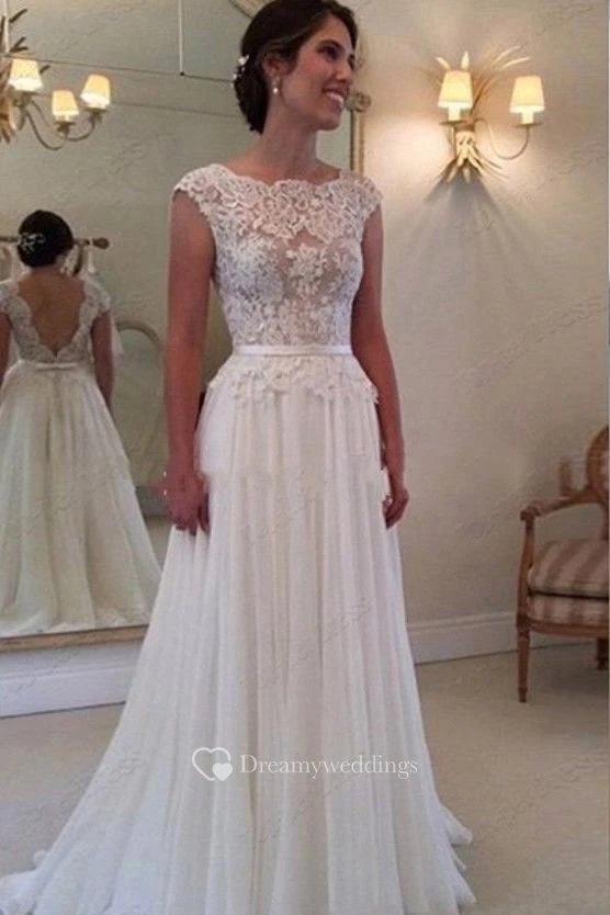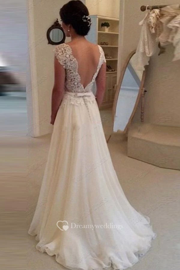 Chiffon Long Lace Open Back Wedding Dress Sleeveless Elegant