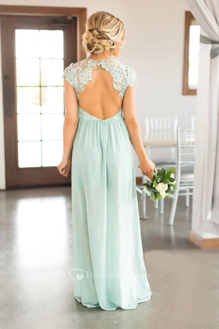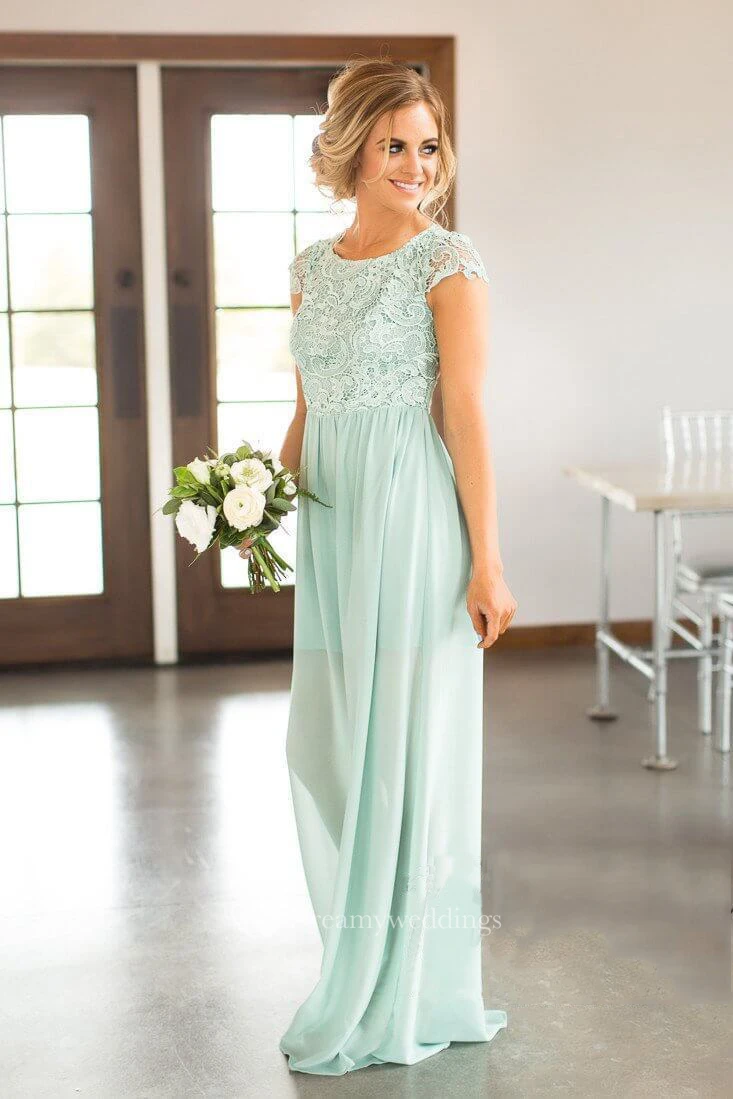 Chiffon Scoop-neck Cap-sleeve Long Bridesmaid Dress with Applique
