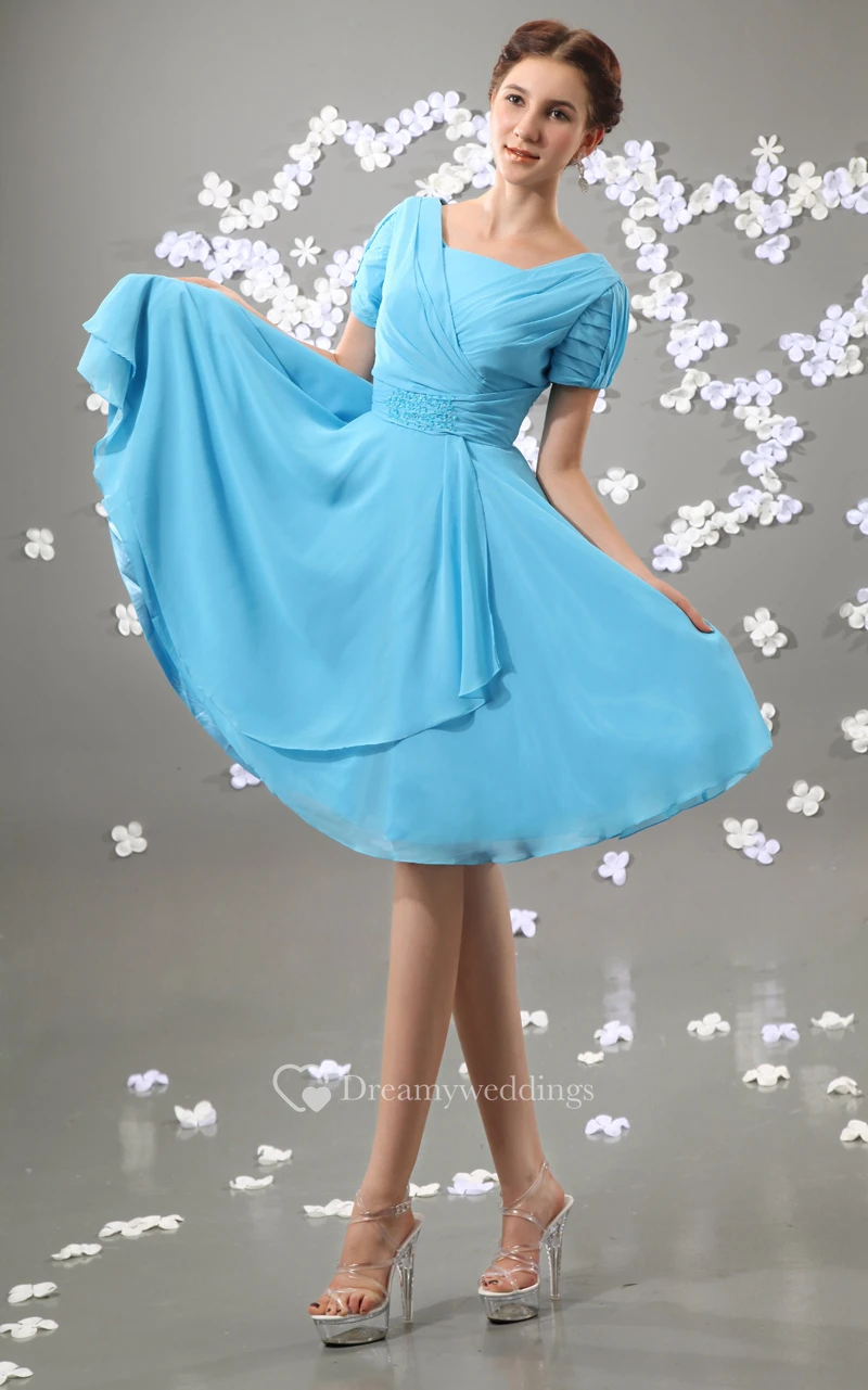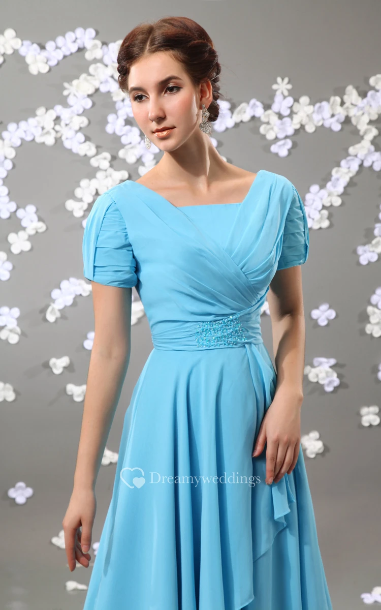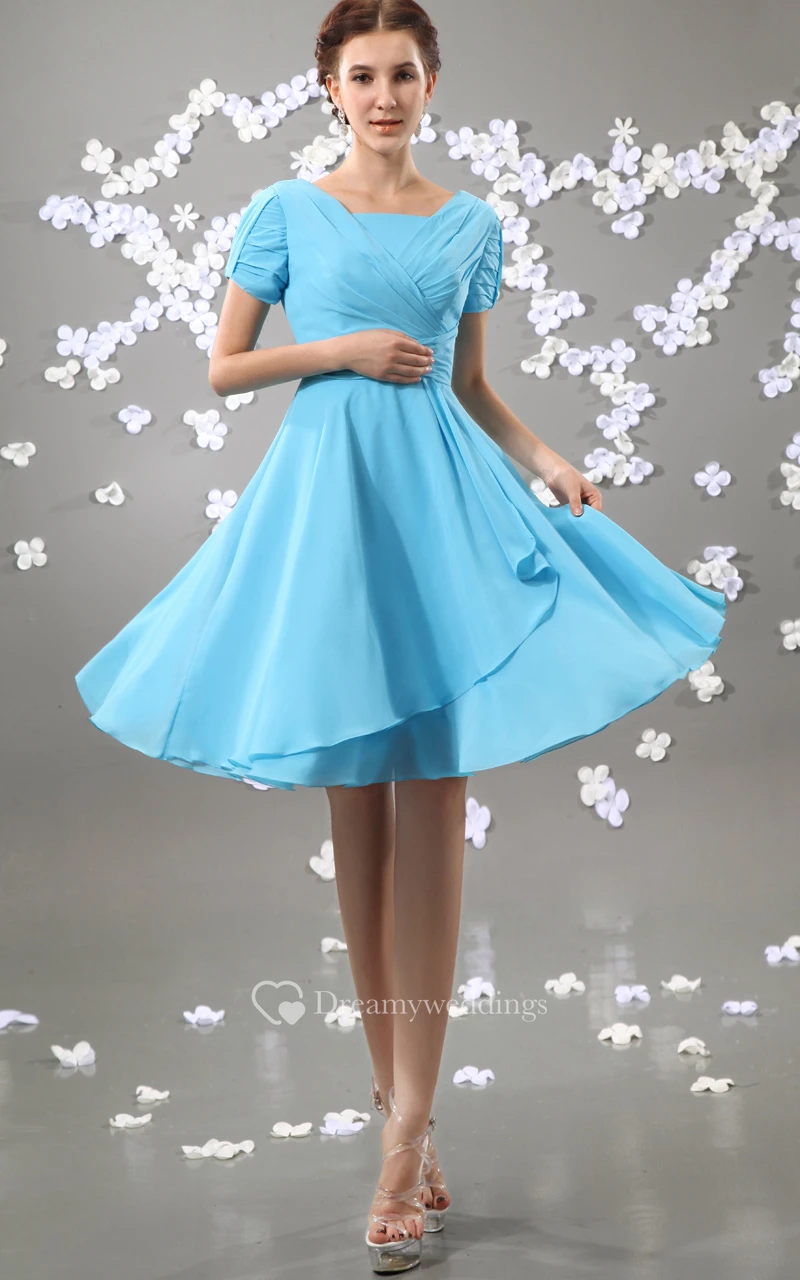 Chiffon Square-Neck Short Sleeve Dress With Ruching