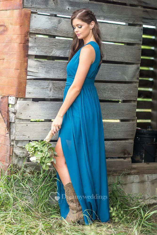 Chiffon V-neck Sleeveless Bridesmaid Dress with Front Slit