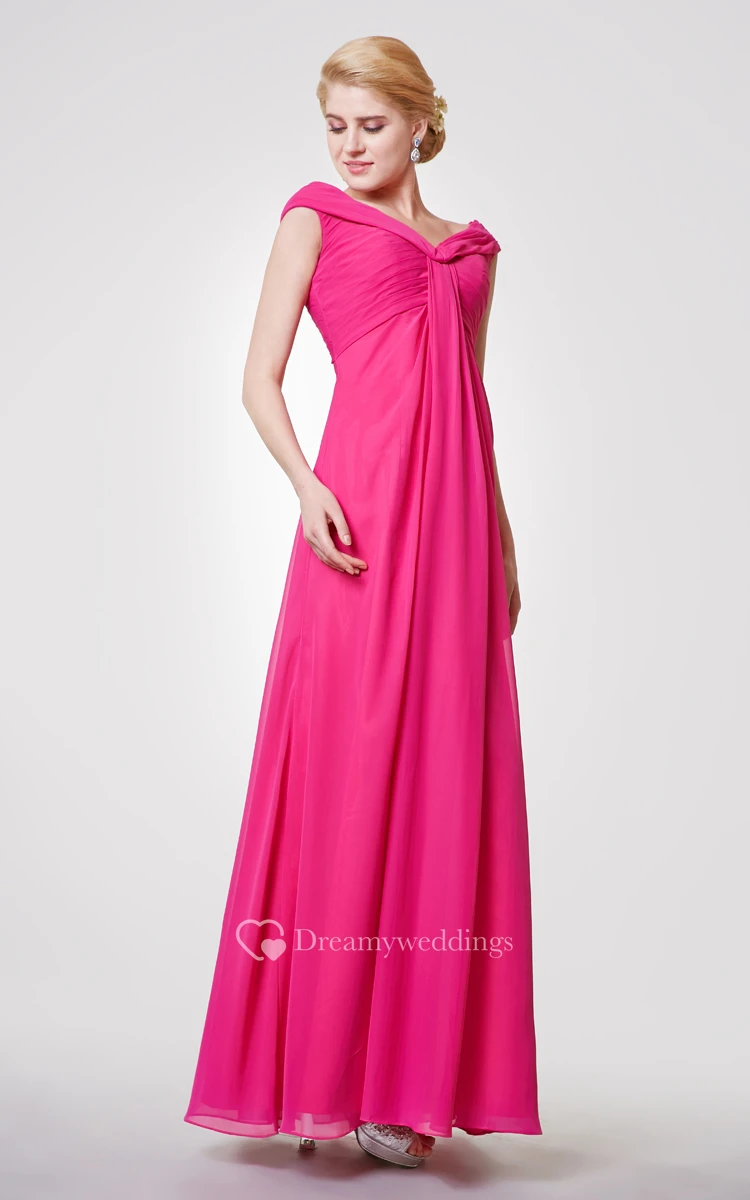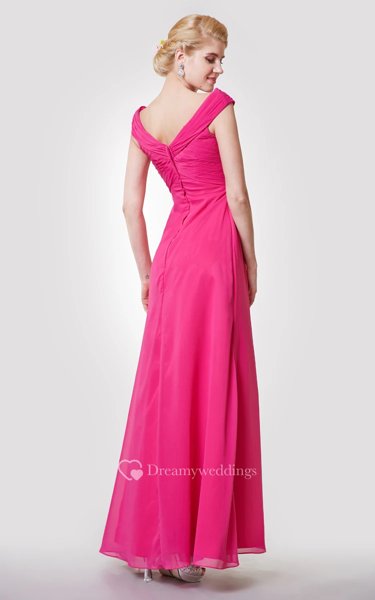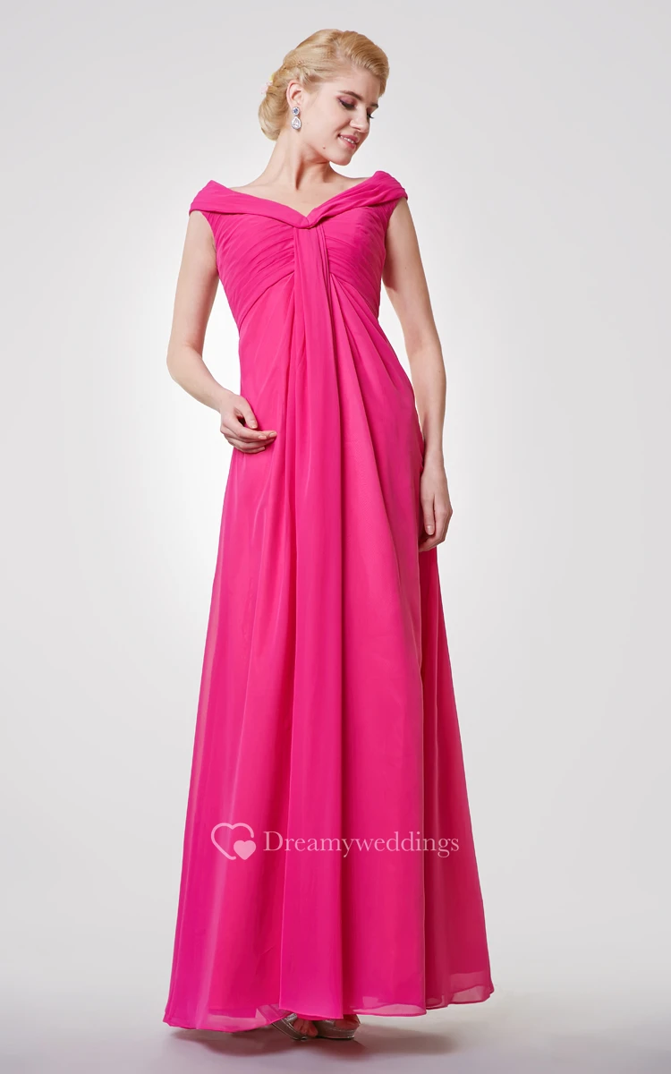 Classic V-neck Cap-sleeved A-line Chiffon Long Dress With Pleats
