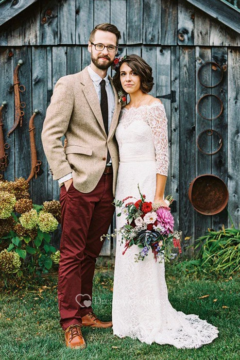 Column Sleeves Lace Off-the-shoulder Bowknot Brush Train Wedding Dresses