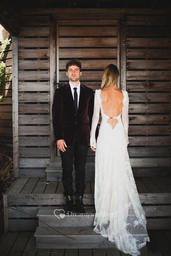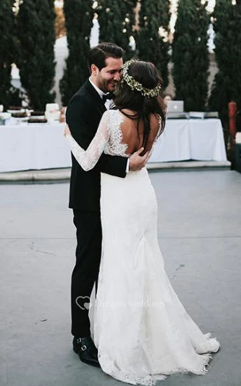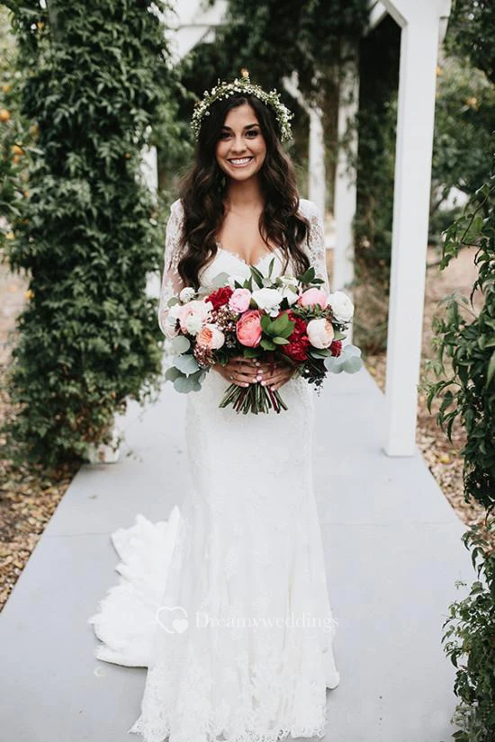 Country Style Sexy Deep V Neck Backless Long Sleeves Lace Court Train Wedding Gown
