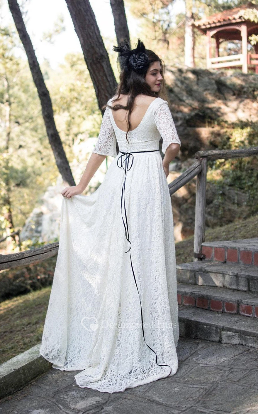 Tea-Length Scoop Neck Lace Dress With Low-V Back