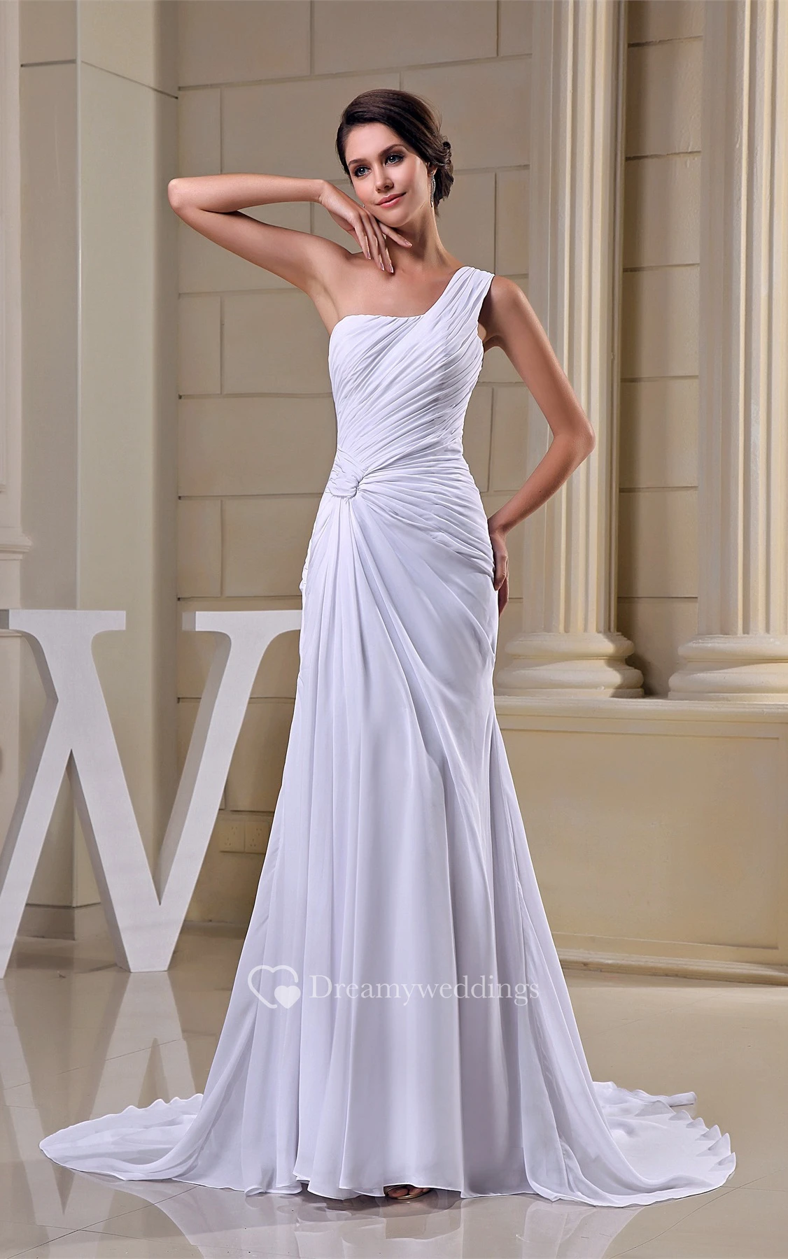 Criss Cross One Shoulder Ruched Chiffon Gown With Pleats and Court Train