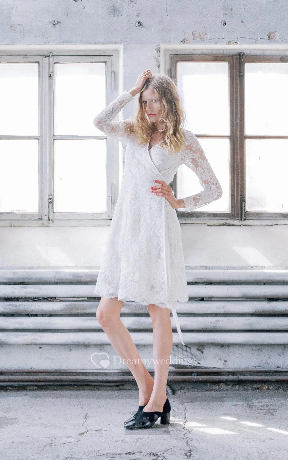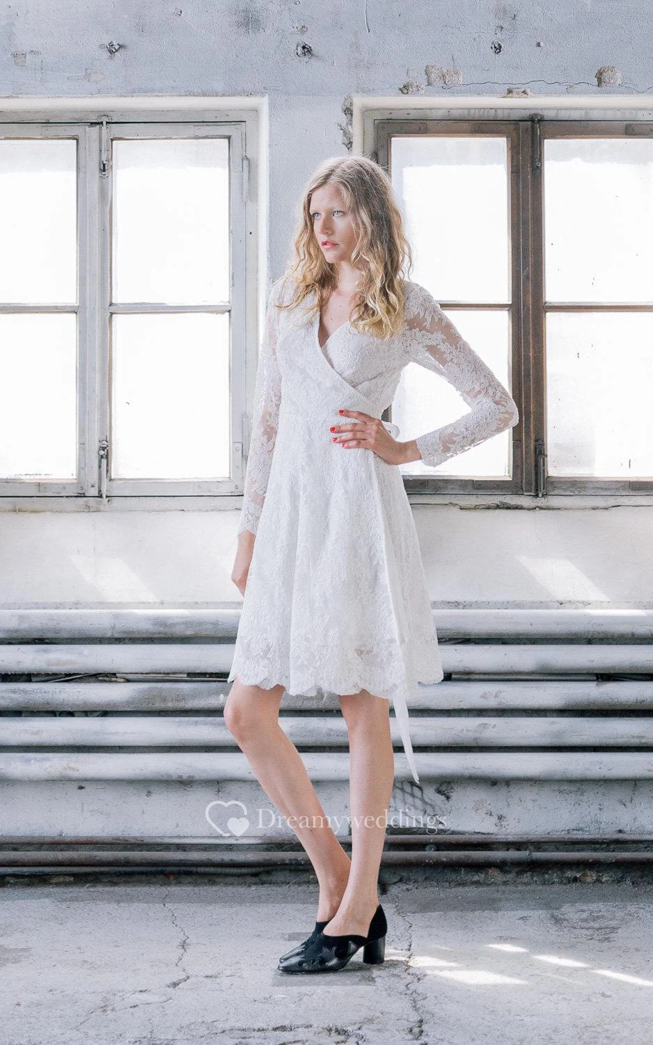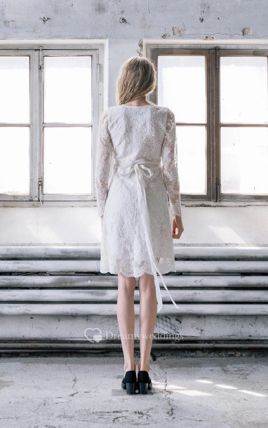 Crisscross V-Neck A-Line Long Sleeve Short Lace Dress With Back Bow