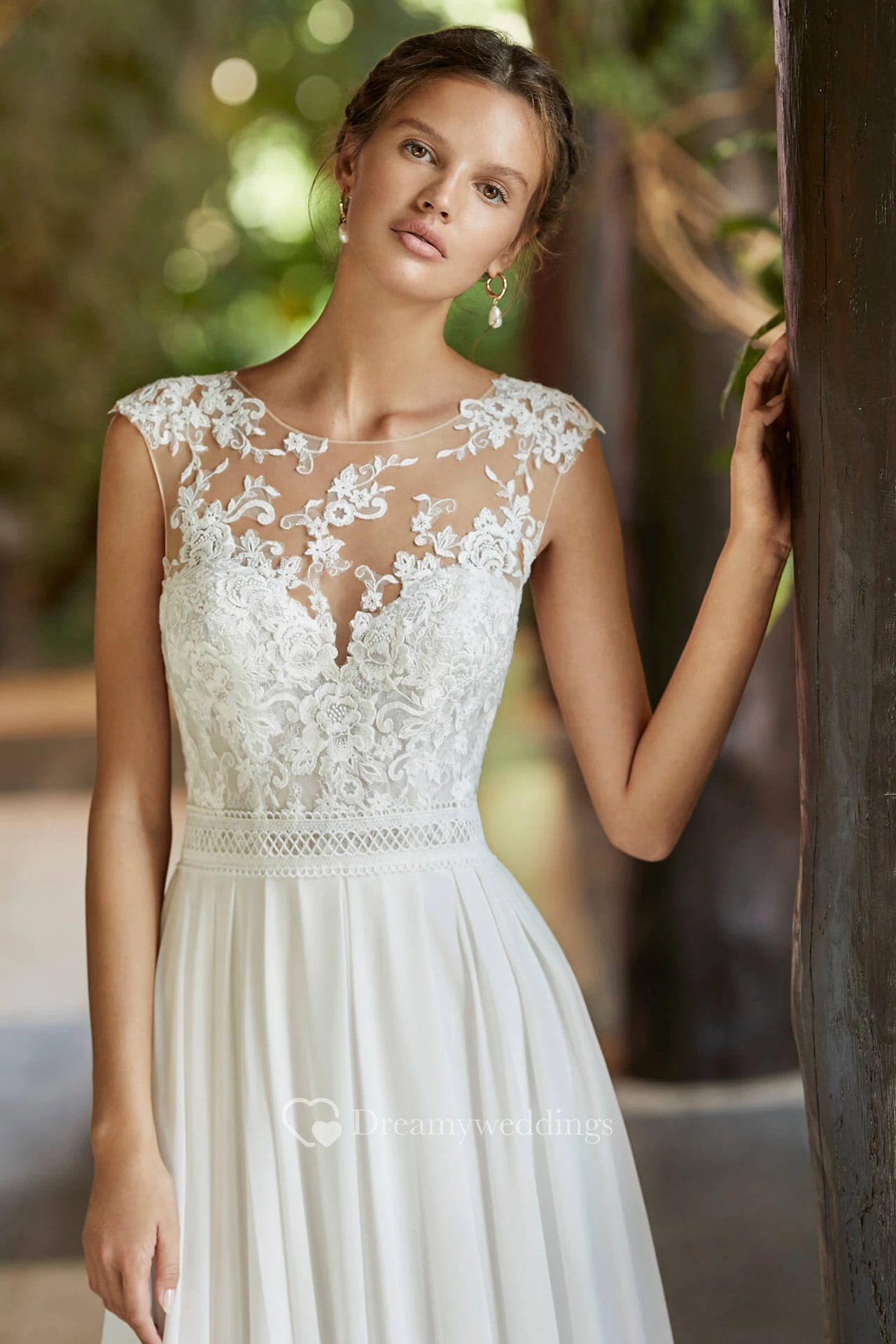 Deep V-back Ethereal Cap Sleeve And Court Train Lace Chiffon Wedding Dress