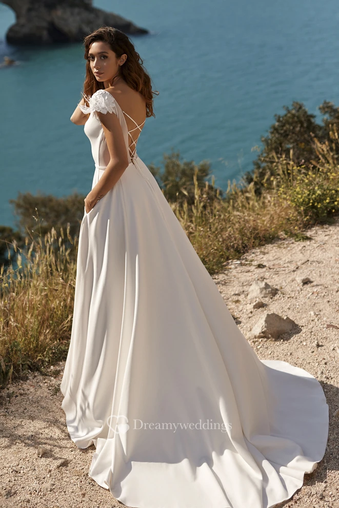 Deep V-back Short Sleeve Back Bateau Satin Wedding Dress With Flower Details And Straps