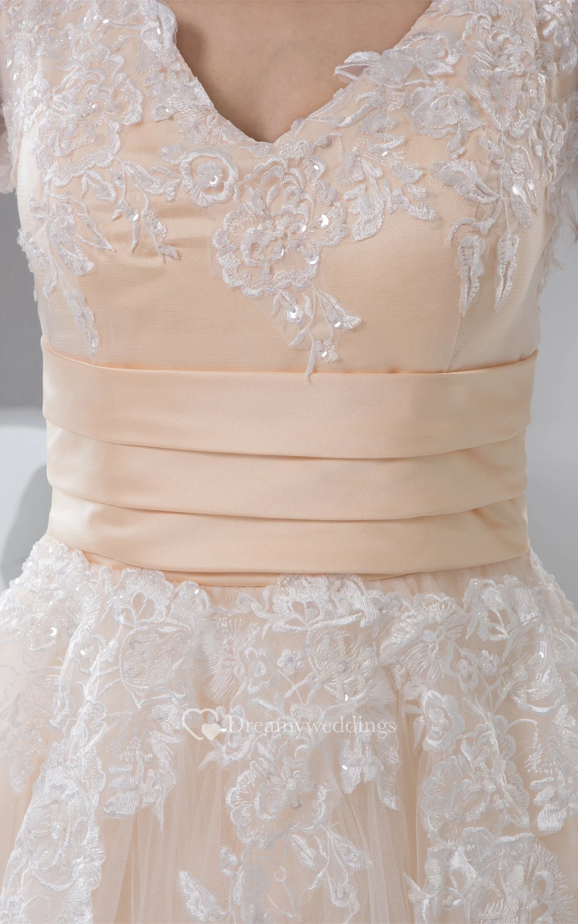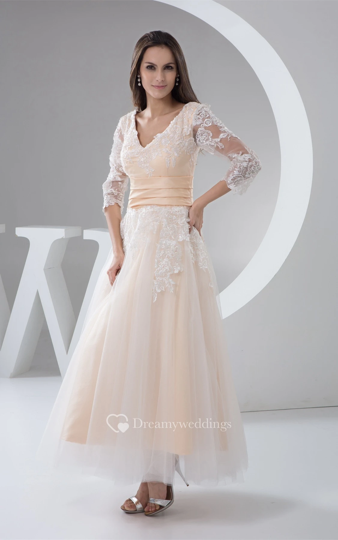 Deep-V-Neck Half-Sleeve Ankle-Length Lace Dress With Pleats