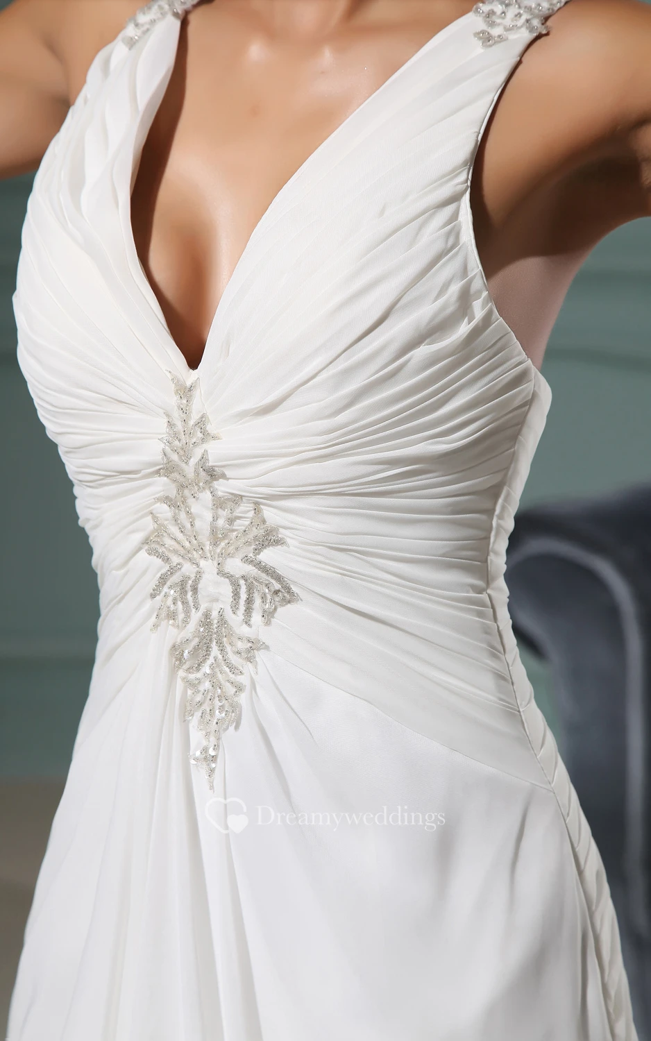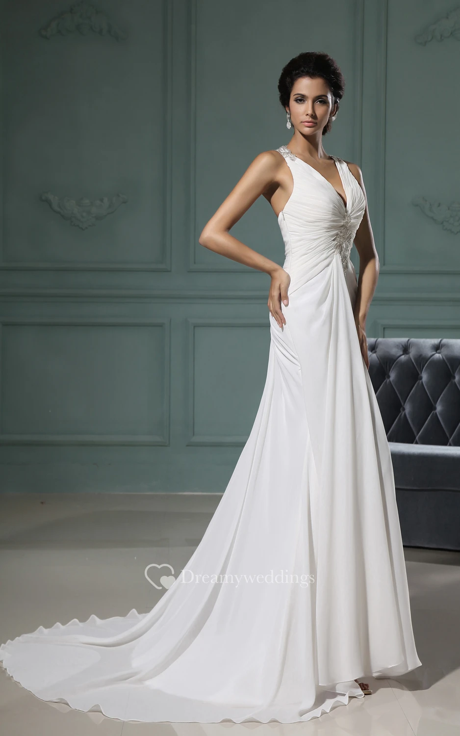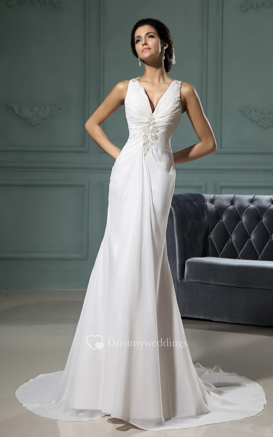 Deep V-Neck Ruching Sheath Chiffon Dress With Brush Train